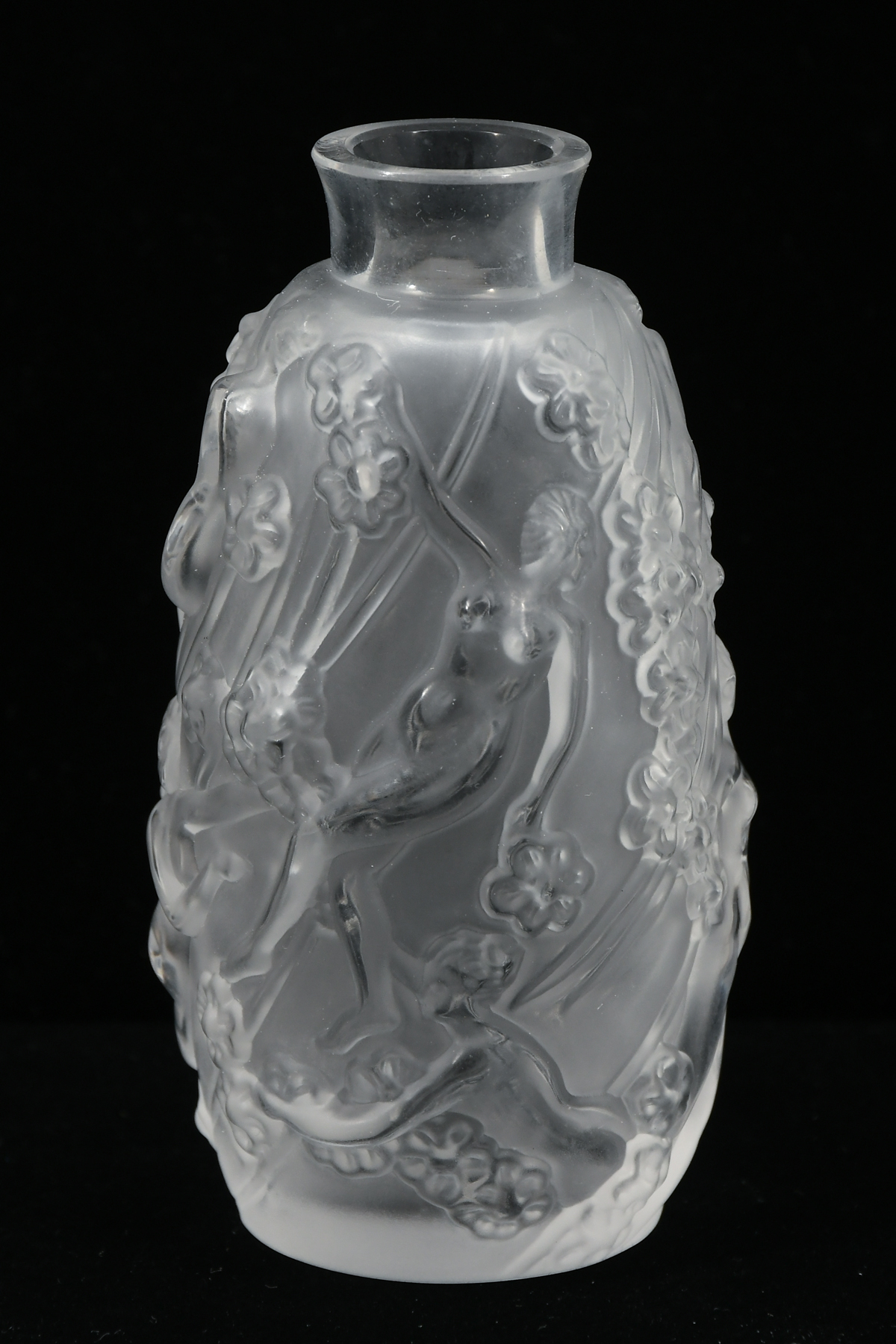 5 PC. LALIQUE CRYSTAL COLLECTION: Includes opalescent knotted heart paperweight, Daphne trinket box w/ hinged lid, Saint Nicholas ashtray, Femme Fleurs 4'' bud vase in box, and Duncan cordial decanter w/ stopper measuring approx. 8'' in height.
