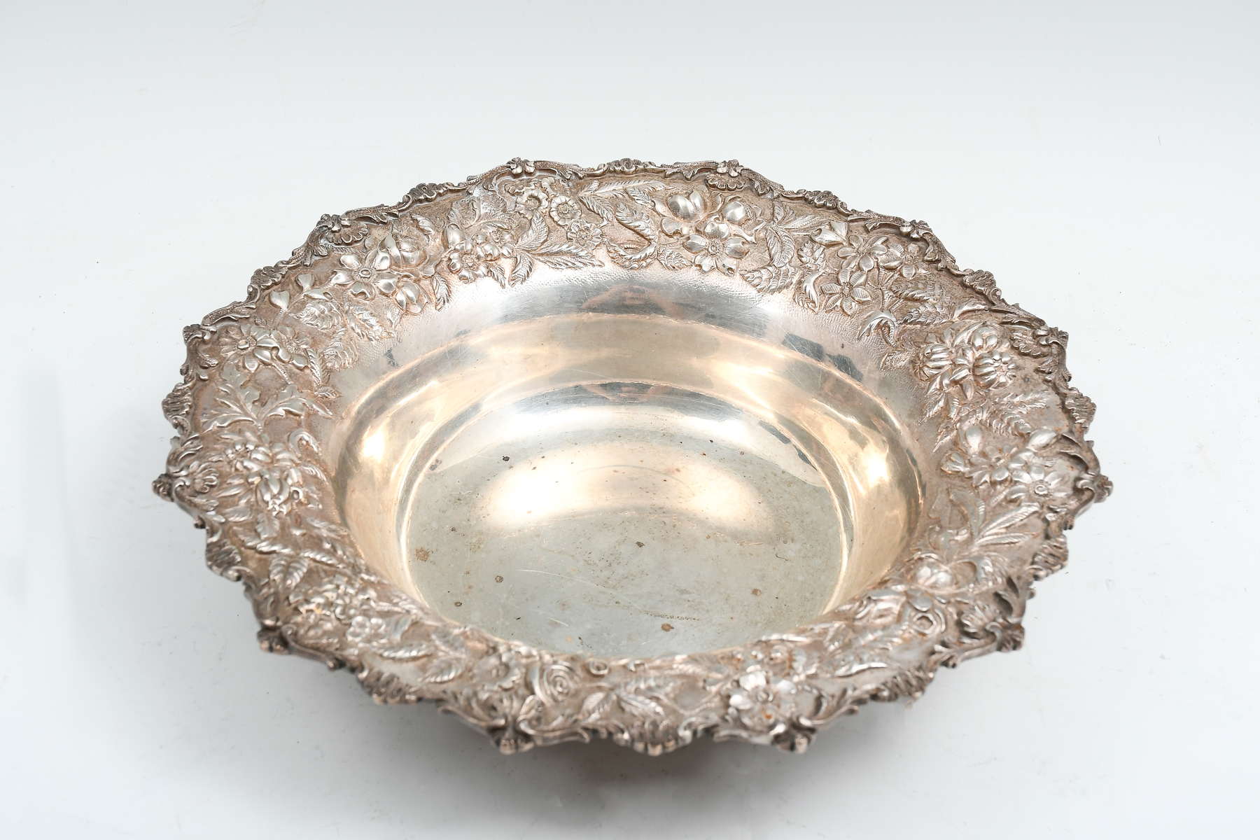S. KIRK & SON REPOUSSE STERLING SILVER BOWL: Approx. 19.16 Troy ounces. Modeled with overhanging border of crisp floral repousse decoration, against a stippled ground, applied scrolling foliate rim. Approx. 2.5'' h x 11.25'' dia.