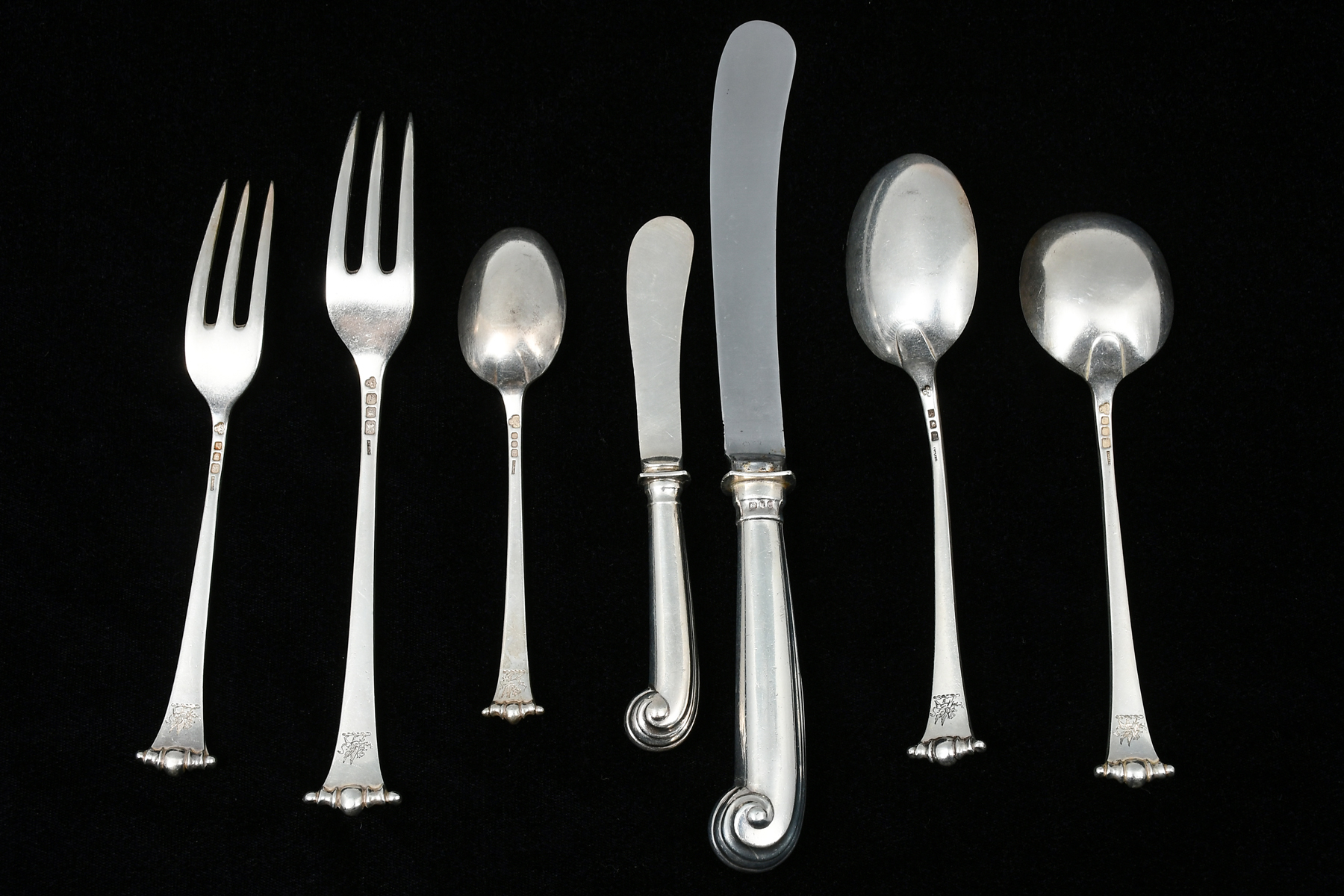 83 PC. ENGLISH C.J. VANDER ELIZABETH II ONSLOW STERLING SILVER FLATWARE: Approx. 126.30 Troy ounces. Comprising; 12- Dinner Knives, 12- Dinner Forks, 12- Luncheon Forks, 8- Soup Spoons, 13- Teaspoons, 14- Table Spoons, & 12- Butter Knives. All having scrolled handles with an engraved Griffin. Elizabeth II Onslow Pattern made by London Silversmith C.J. Vander, 20th-century.