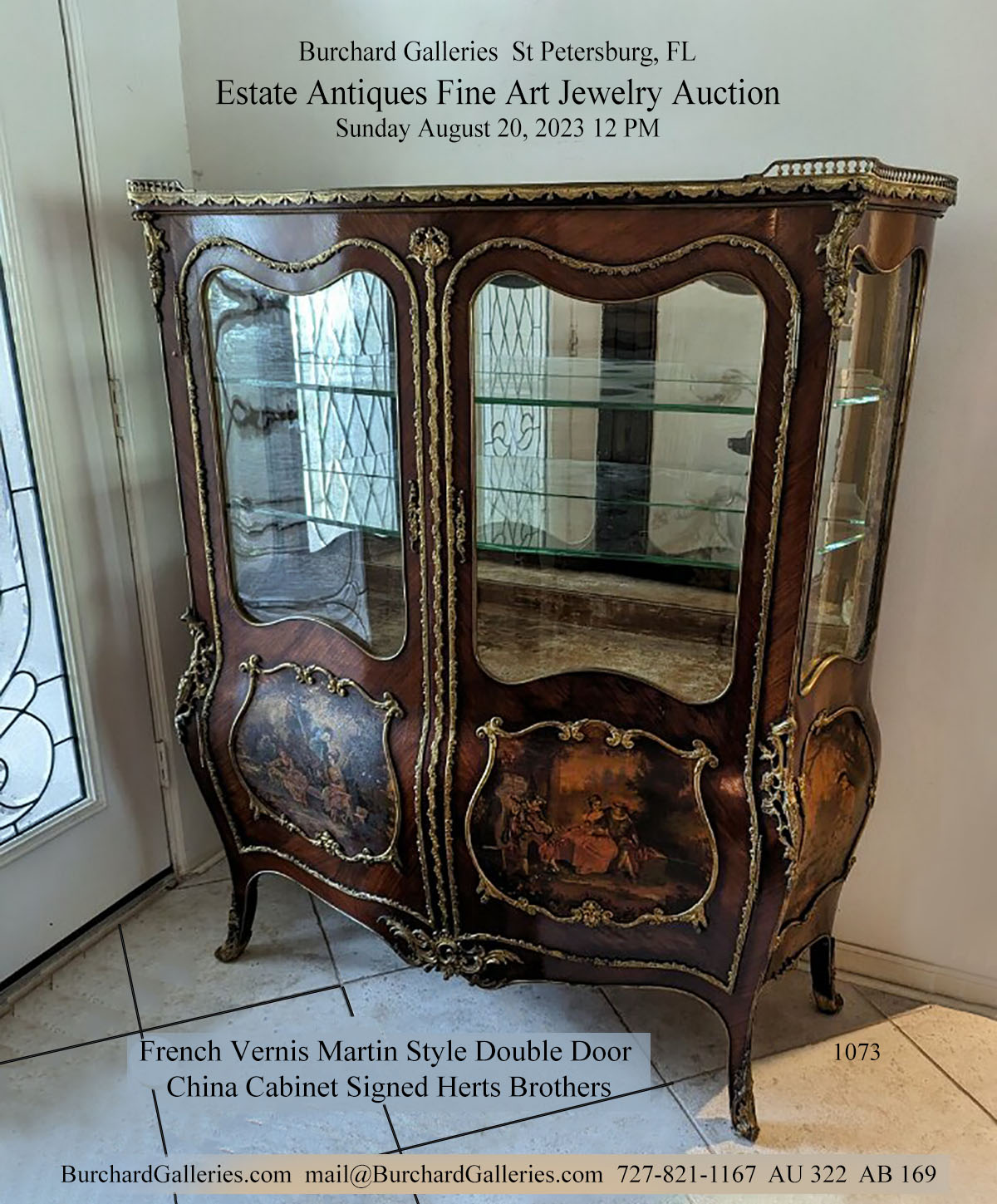 HERTS BROTHERS FRENCH VERNIS MARTIN STYLE DOUBLE DOOR CABINET: Herts Brothers Louis XV style cabinet with pierced gallery, glazed doors, and Vernis-Martin scenic panels. Inside are two tiers of contoured glass shelving before a mirrored back, with velvet-lined lower shelf. Adorned with brass ormolu trim. Original label on back reads ''Herts Brothers Furniture Makers, Interior Decorators, Architectural Wood Workers, Broadway & Twentieth St., New York.''. Approx. 55'' h x 48'' w x 17'' d.