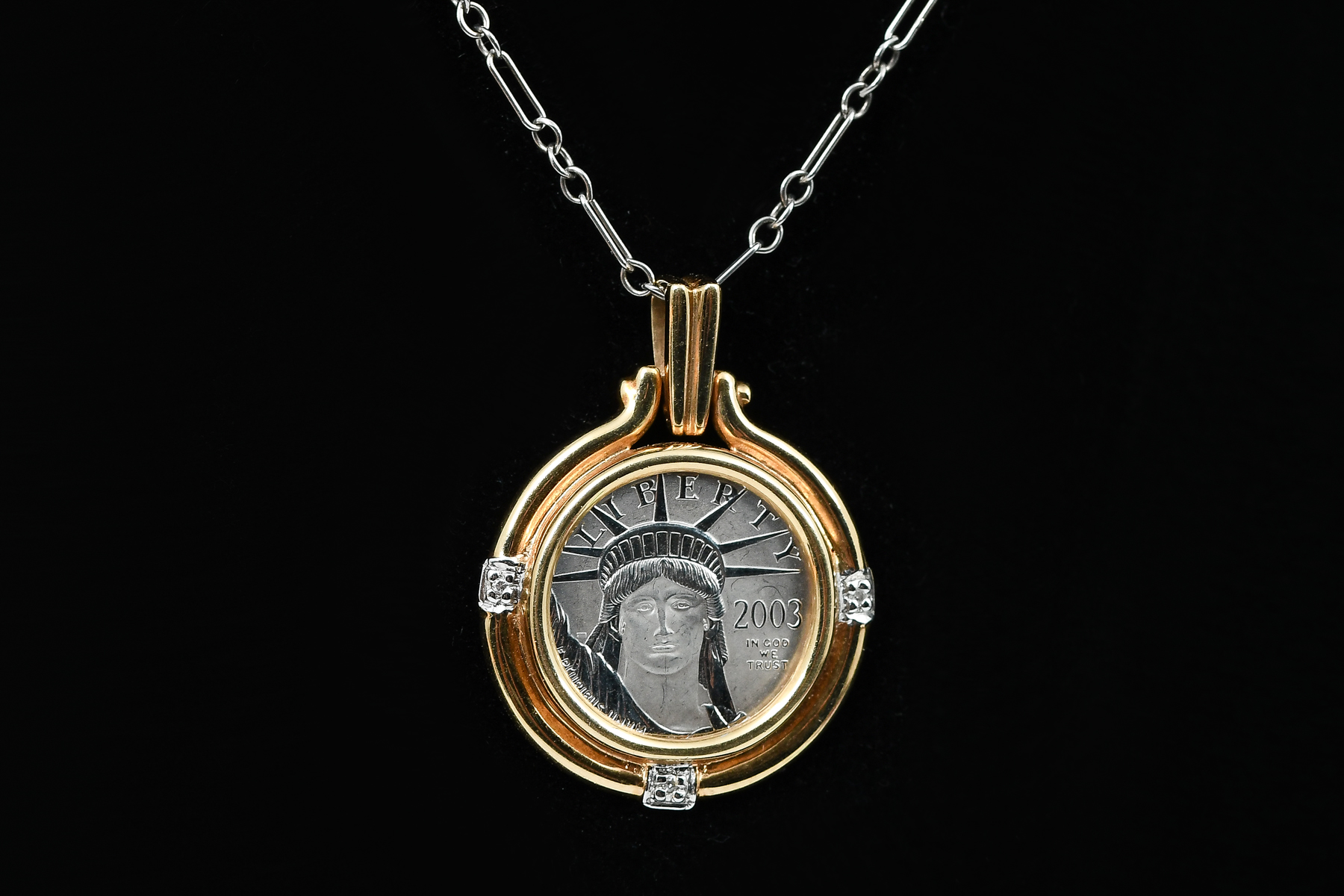 14K FRAMED PLATINUM LIBERTY COIN: A platinum $10 1/10 Oz. US coin set within a 14K yellow gold frame containing three round brilliant cut diamonds, which weigh approx. .03 ct. On an 18K white gold 16'' chain. The gold weighing 5.2g. Total weight of pendant and chain is 8.2 g.