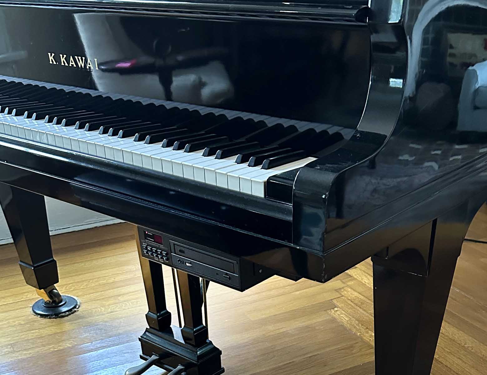 K. KAWAI MODEL 650 BLACK LACQUER GRAND PIANO: 6'8'' Kawai Grand Piano, serial number 8565. Comes complete with a QRS Pianomation (The Invisible Player) along with many discs.