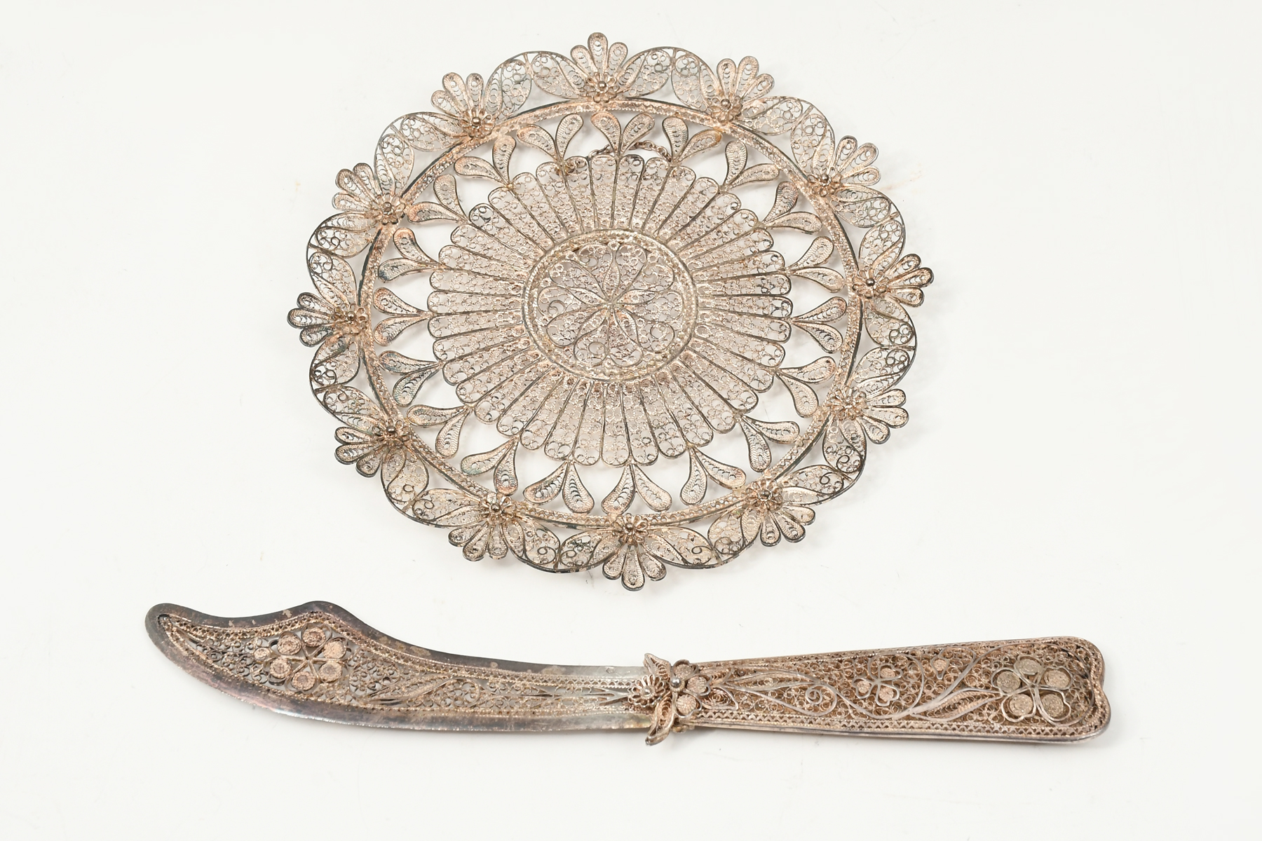 5 PC. ALBANIAN & AUSTRO-HUNGARIAN SILVER FILIGREE ITEMS: Approx. 26.52 Troy ounces of .900 Silver. Comprising; 1- Hungarian Knife, 1- Hungarian hanging Dish, 2- Albanian Silver Vases, & 1- Unmarked Vase. All of Hand-made filigree Coin Silver with a stylized floral & foliate design. Largest Approx. 8.75'' h x 4.5'' dia.
