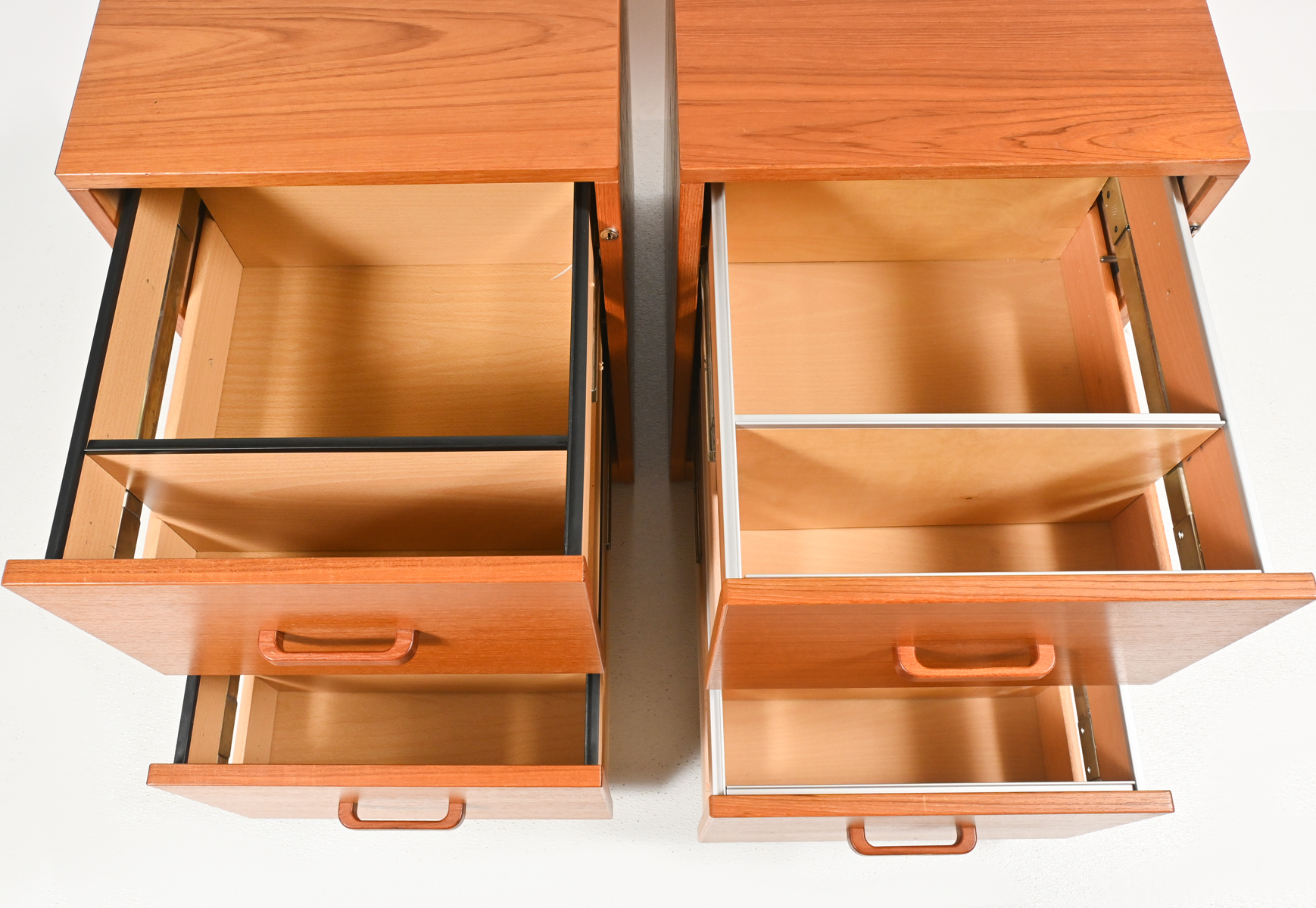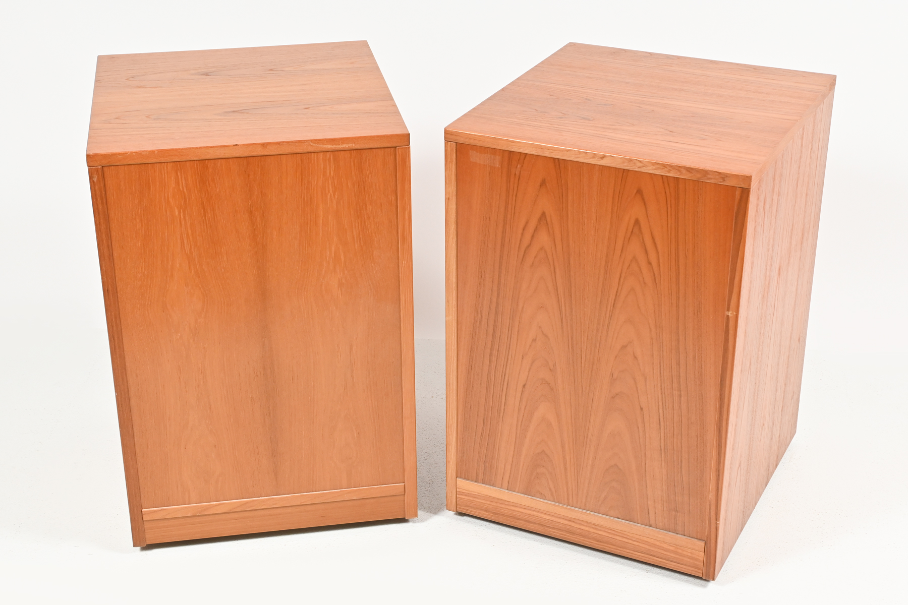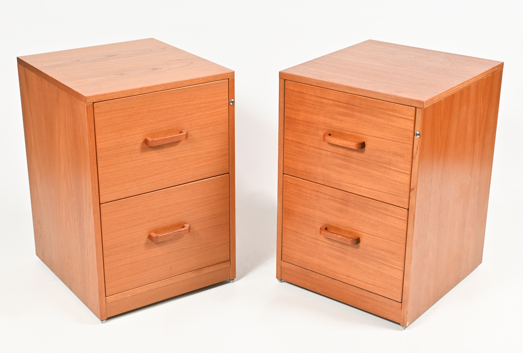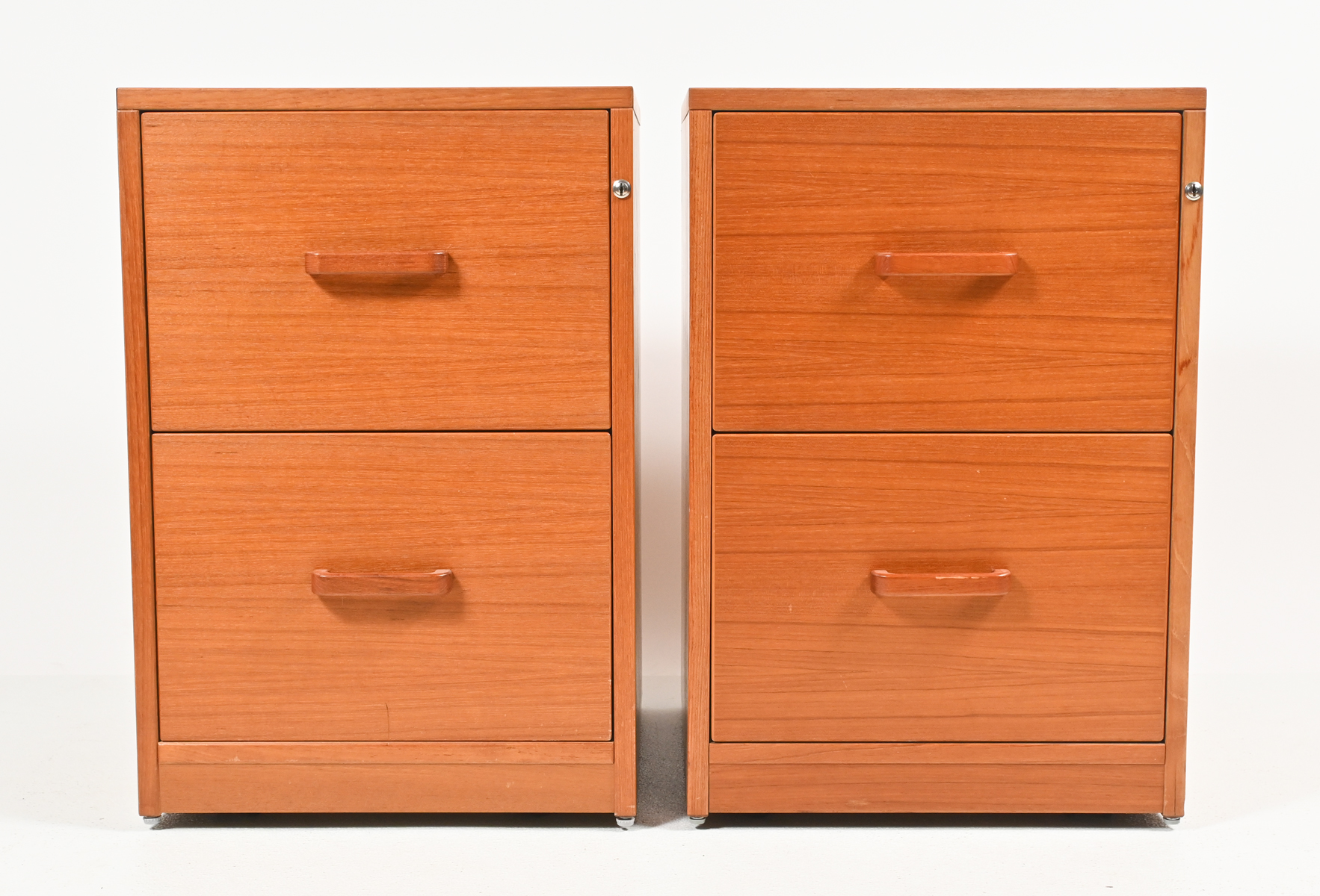2 TEAK DANISH FILING CABINETS: A pair of Danish Modern teak wood filing cabinets, each with two stacked, locking file hanger drawers. With contoured wood handles, resting upon casters. Approx. 27'' h x 18'' w x 20'' d.