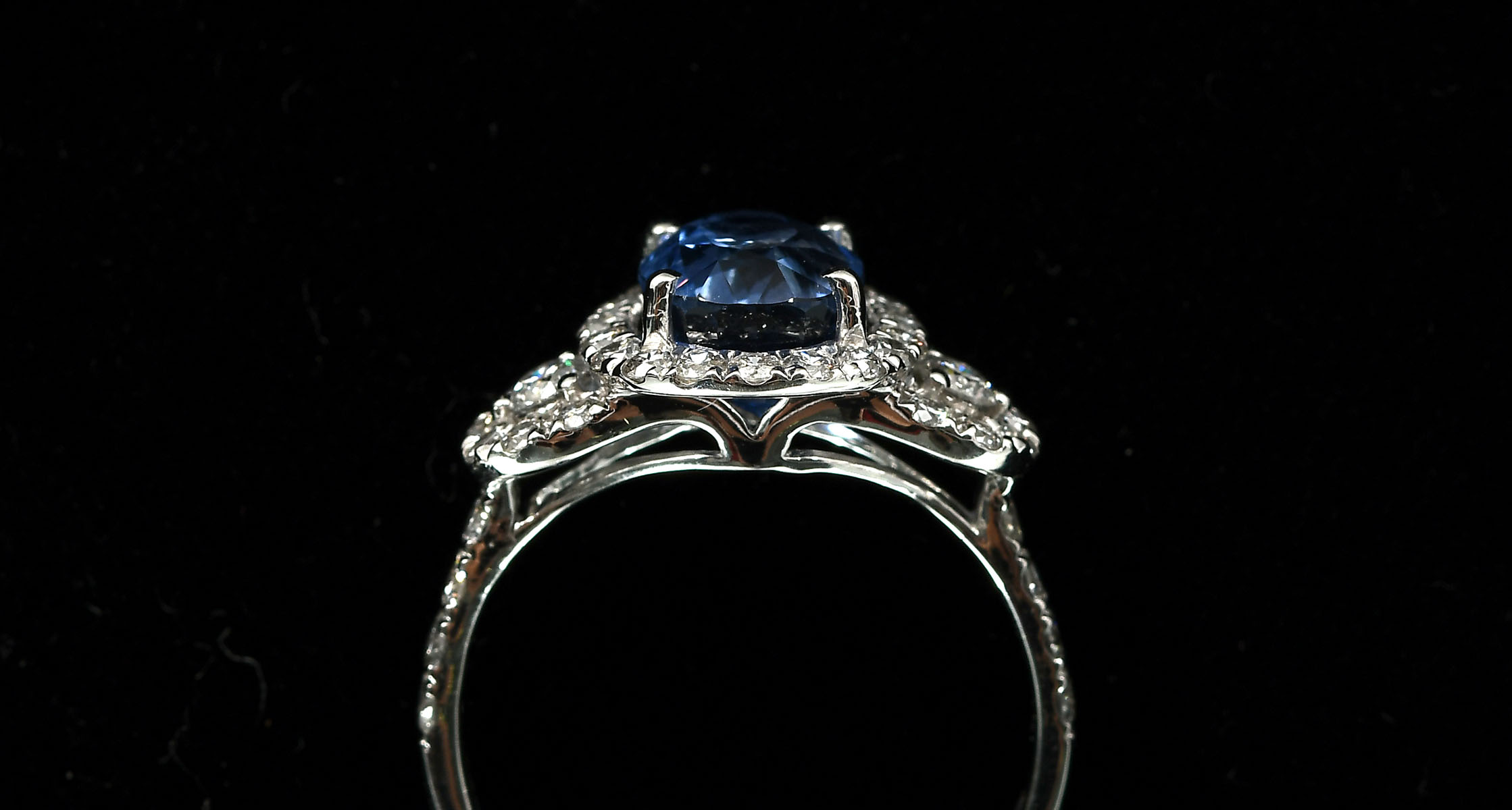 PLATINUM DIAMOND AND SAPPHIRE LADIES RING: Rare unheated sapphire, diamond, and platinum ring. The blue, oval, mixed-cut sapphire weighing approx. 3.18 ct. rated VS in clarity (Type II), B in Hue, 4 in Tone and 3 in Saturation. Surrounded by 40 round brilliant cut diamonds weighing approx. .91 ct. rated VS-SI in clarity and G-H in color. Signed Oscar Friedman. Total weight is 4.8 grams. Size 7. Sold with GIA Gemological report.
