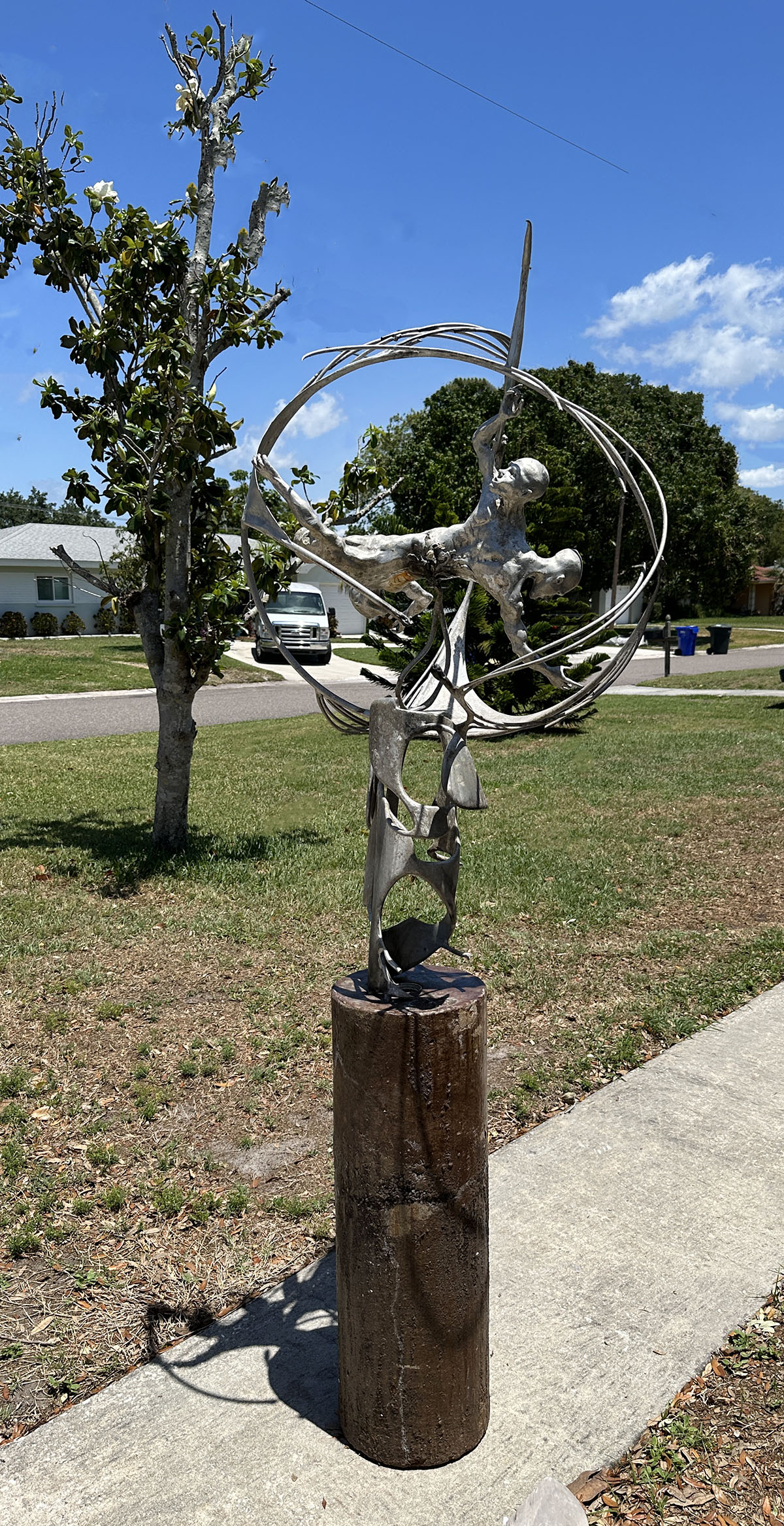 ALUMINUM 4-HEADED MAN MODERNIST SCULPTURE: Definitely a one-of-a-kind creation! Sculpture detaches from cement column. Sculpture 49''h, with base, 83''h, 29''w.