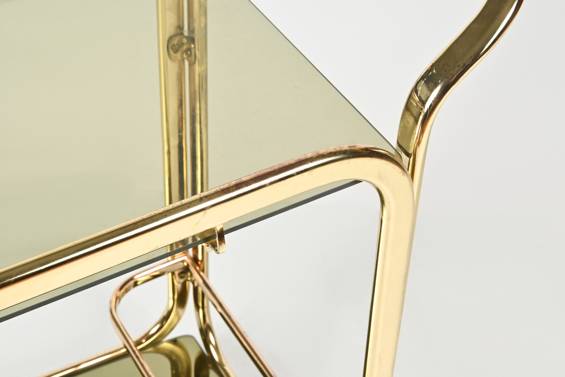 BRASS HOLLYWOOD REGENCEY BAR CART: Hollywood Regency Morex drinks cart / bar trolley with lacquered brass frame and two tiers of u-shaped glass, the top tier being smoked glass, the bottom being mirrored smoked glass. Having a swept-back handle & lower tier bottle holder, all atop smooth-rolling casters. Approx. 33'' h x 33'' w x 17'' d.