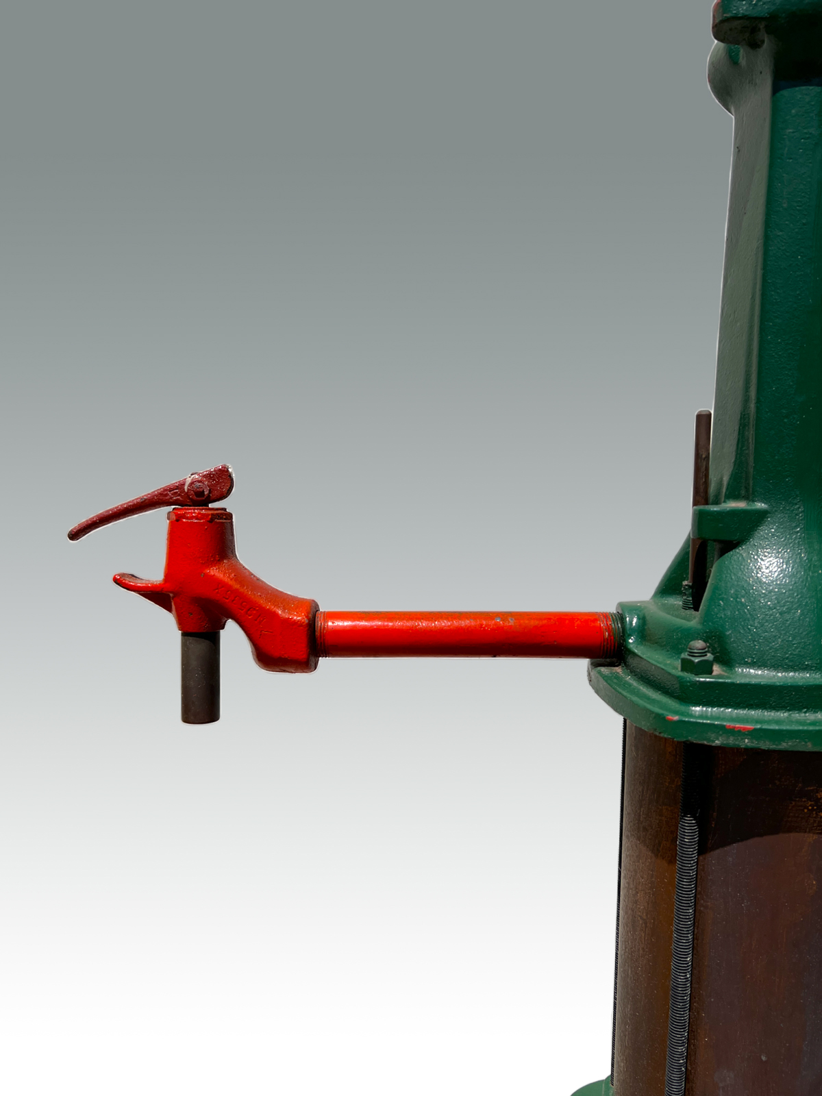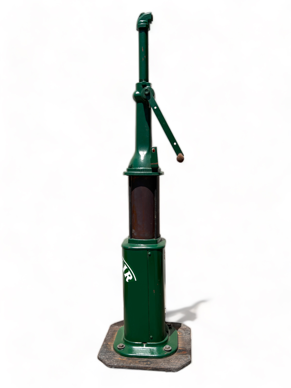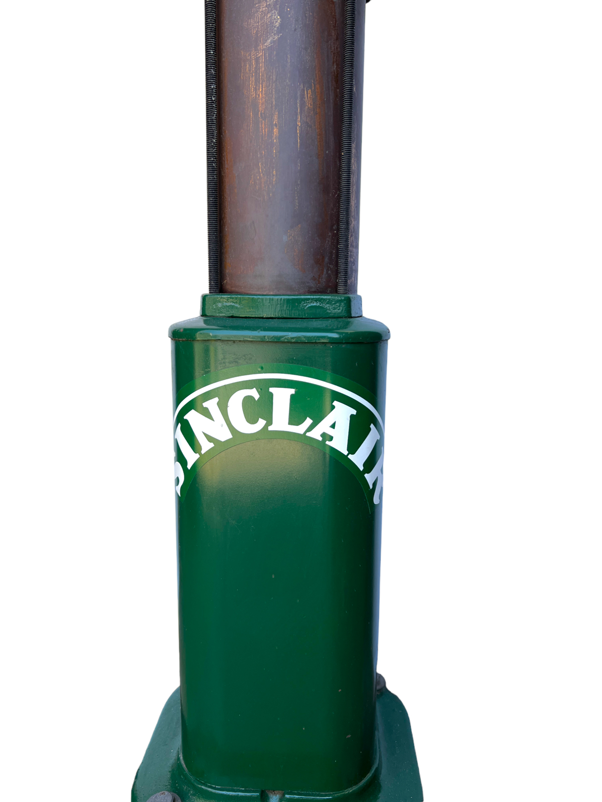 SINCLAIR KEROSENE DISPENSER PUMP: An early Sinclair service station hand crank kerosene pump, in vibrant green with crisp white Sinclair graphic text at base and bright red spigot. Mounted on wood base with casters. Approx. 61'' h. x 25'' w. x 16'' d. The base is 16'' x 16''.