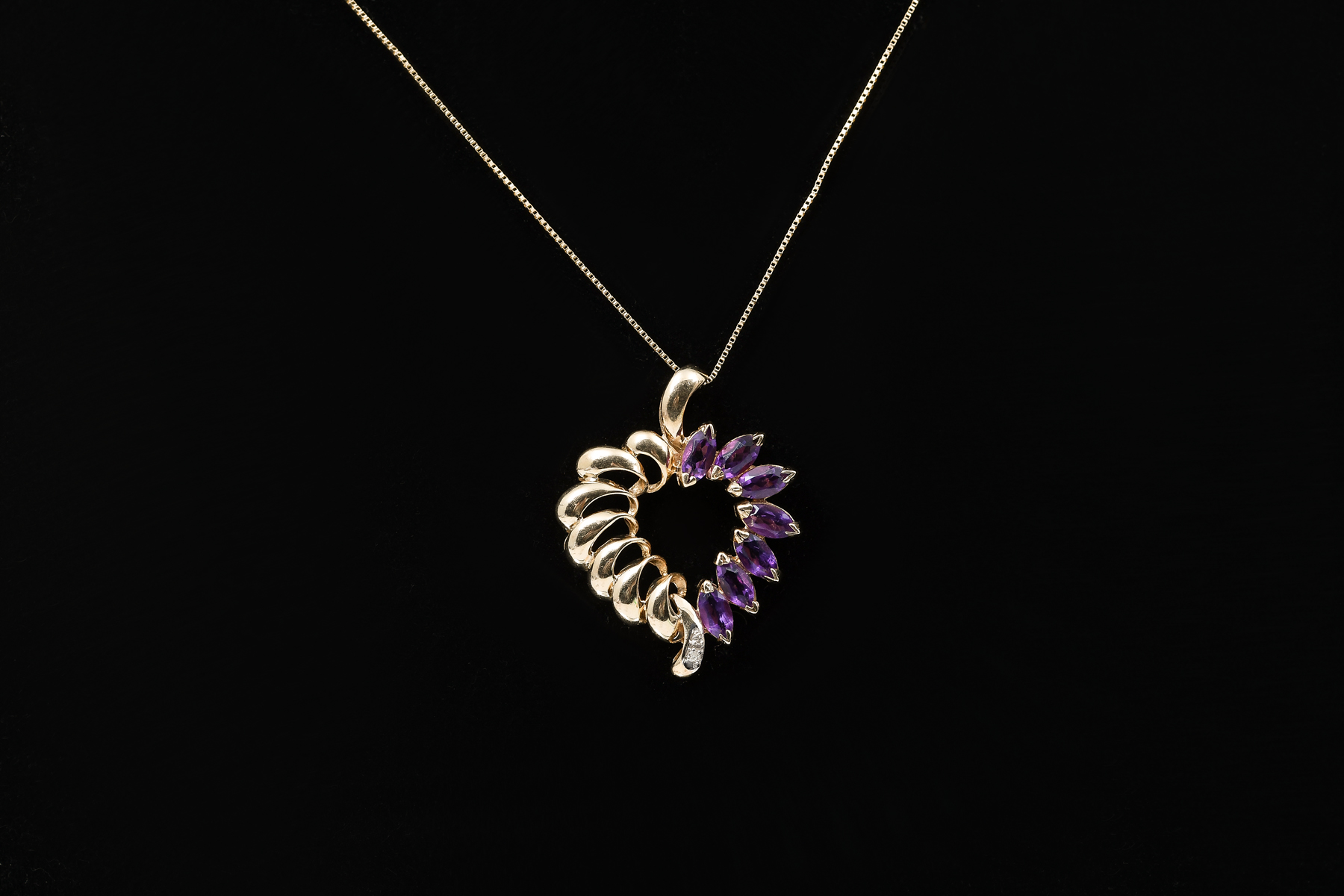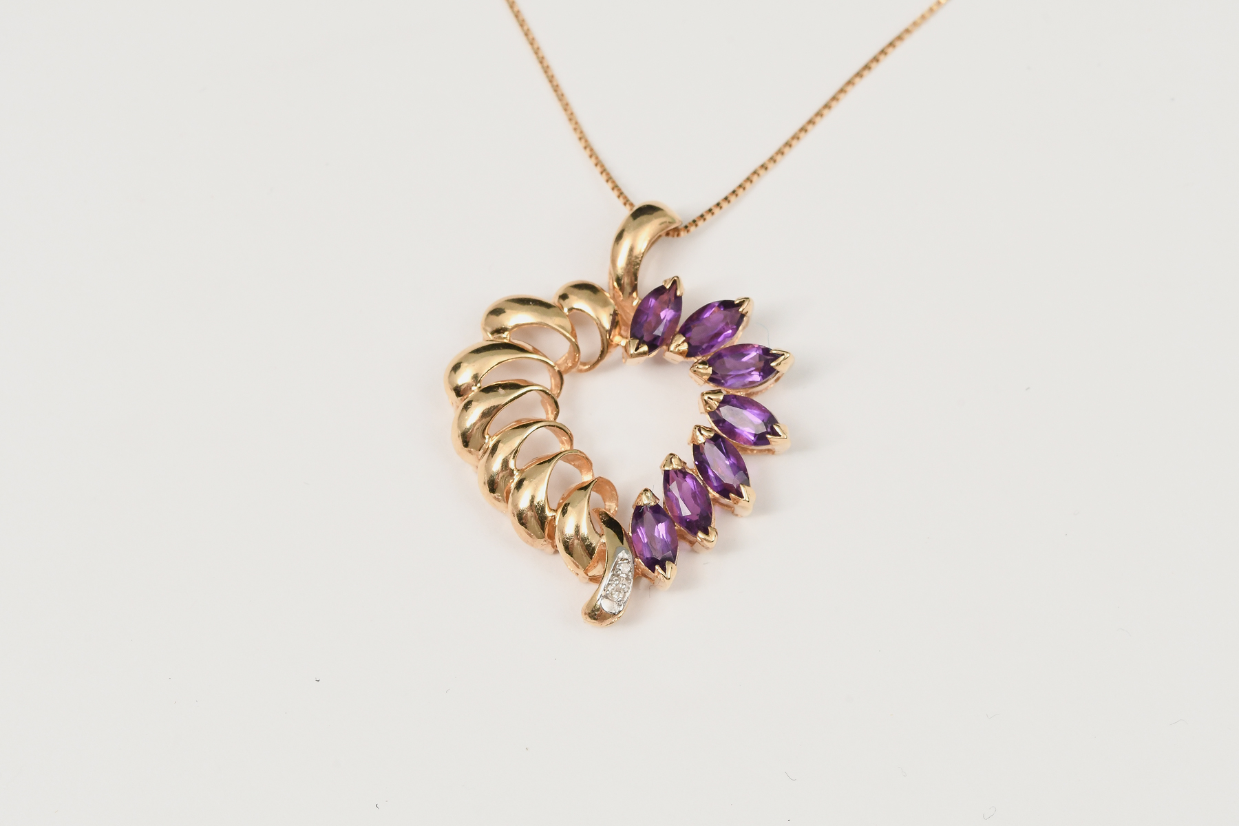 14K ITALIAN BOX LINK CHAIN WITH DIAMOND AND AMETHYST HEART PENDANT: A 14K yellow gold pendant containing 7 marquise mixed cut amethysts weighing approx. 1.25 ct. and 2 round single cut diamonds weighing approx. .02 ct. rated I1 in clarity and H-I in color. The stones are prong set upon the heart-shaped pendant and attached to a 30'' chain of 14k gold marked near the clasp. The total weight is 4.7 g.
