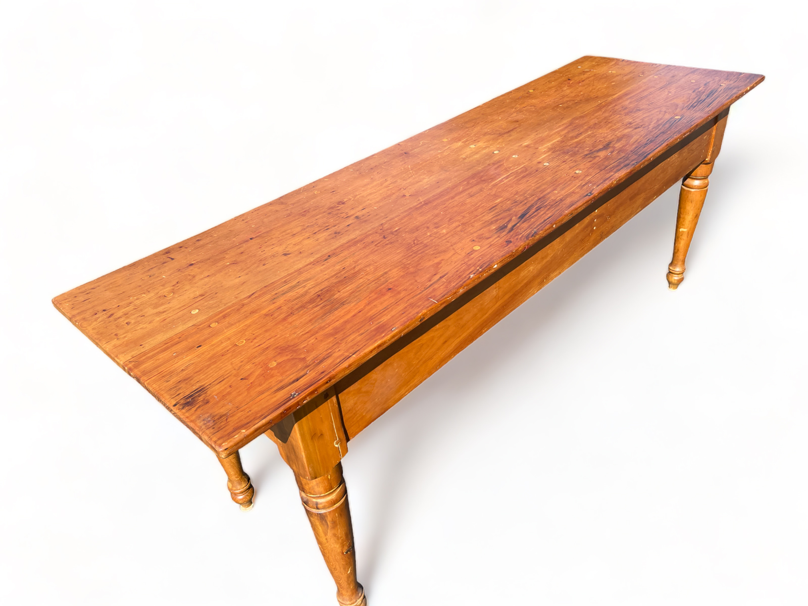 LARGE HARVEST TABLE: A rustic, solid pine wood harvest table exhibiting early hand-forged square head nails at the wide apron. With a two-plank surface all on turned legs. Very solid, with loads of character. Approx. 32'' h. x 85.5'' w. x 27.5'' d.