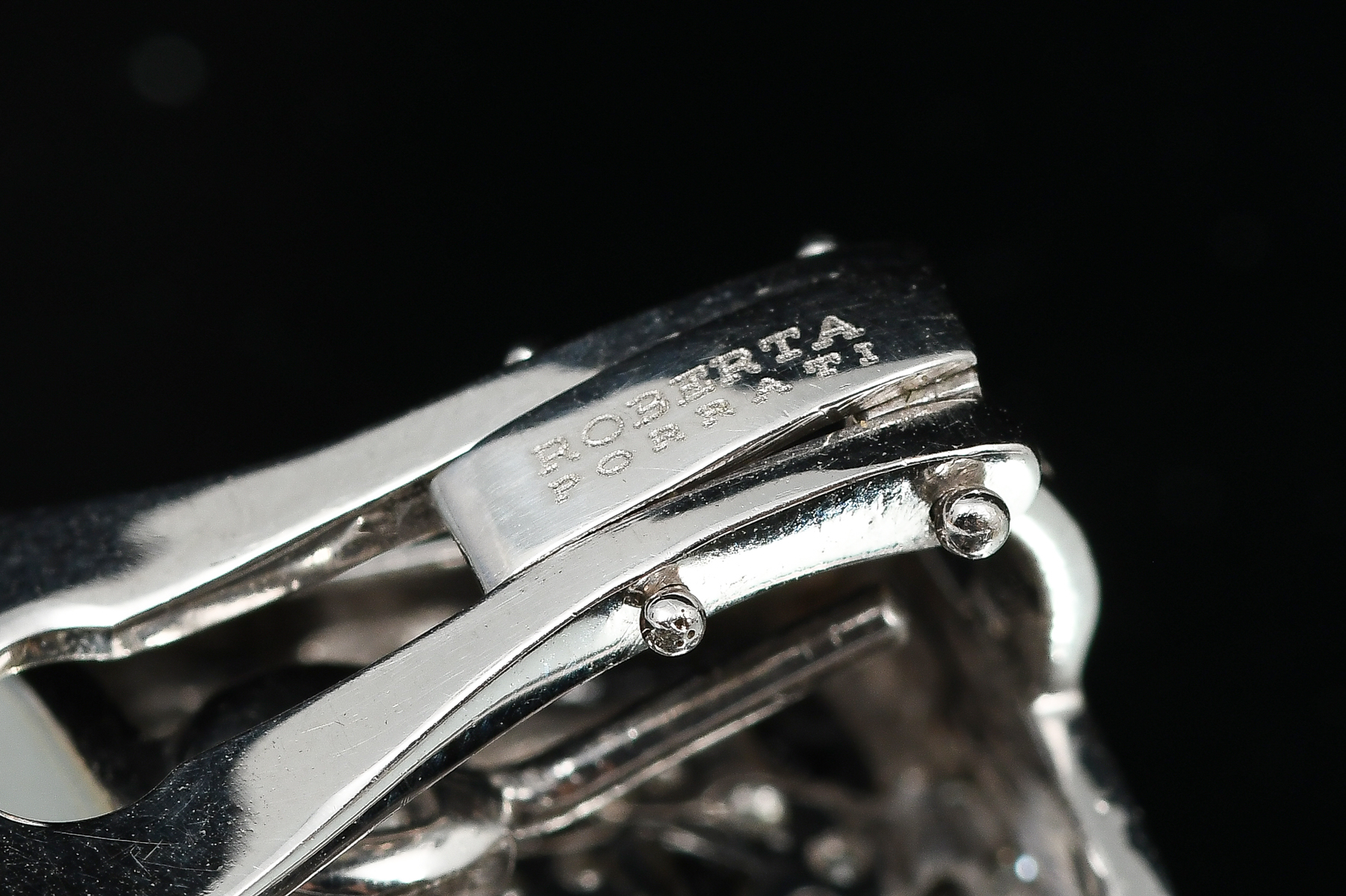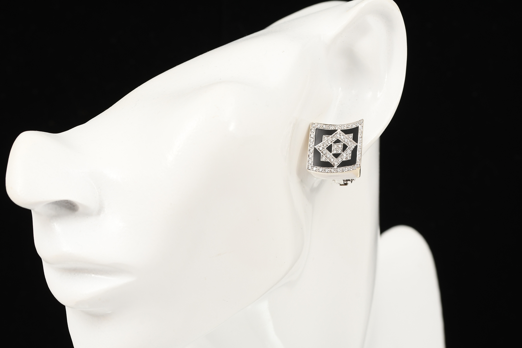 18K ROBERTA PORRATI 18K DIAMOND ENAMEL EAR CLIPS: Black enameled 18K white gold earrings with 116 round brilliant diamonds totaling approx. 1.16 ct., rated VS in clarity and G-H color. All bead set in black enamel. With pivot post and hinged clip closures, signed Roberta Porrati. 5/8'' curved squares. Weight 18.2 grams. Sold with current FDA GIA appraisal of $5,950.00.