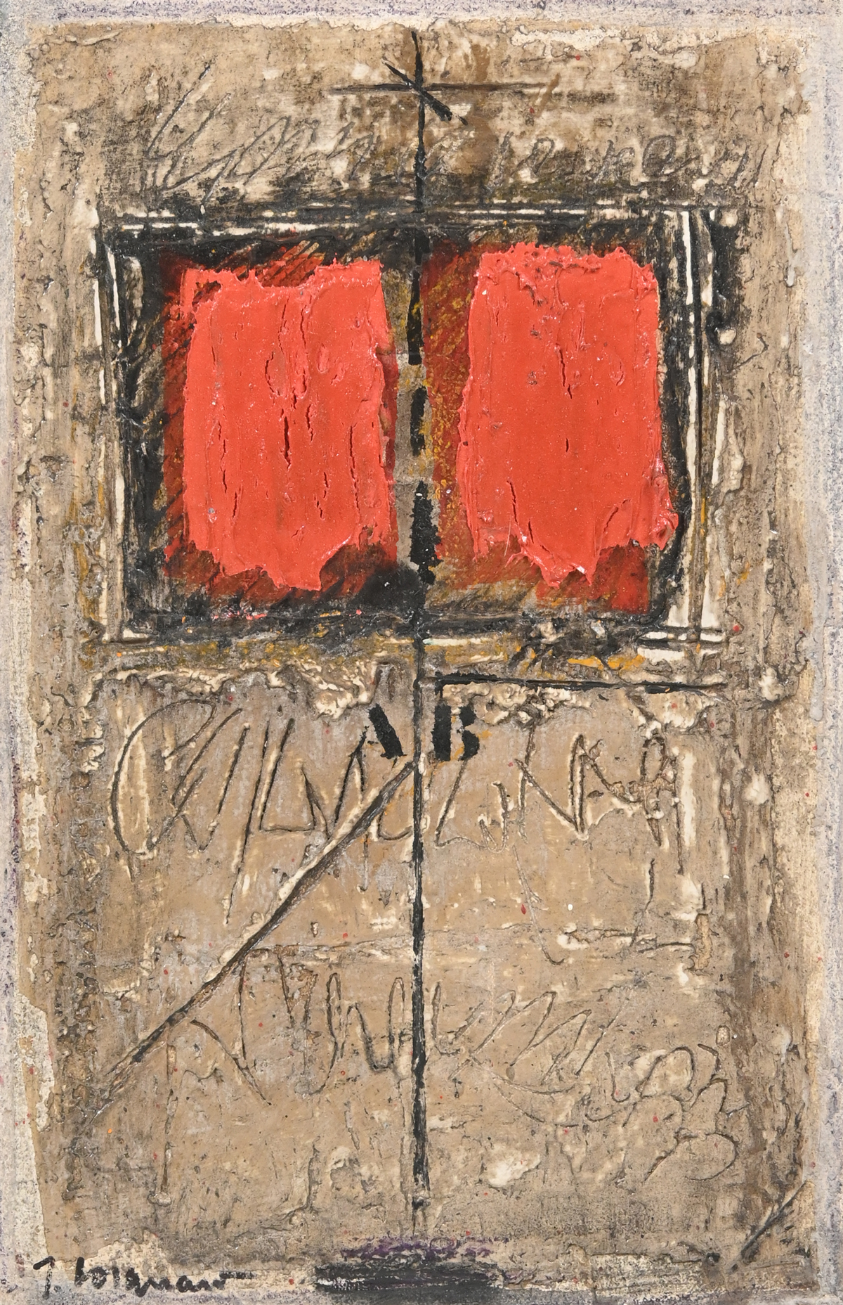 COIGNARD, James, (French, 1925-2008): Abstract Composition Rouge AB, Oil/Canvas, 14'' x 9'', signed lower left, titled verso, dated 1986, framed, 18'' x 13''.