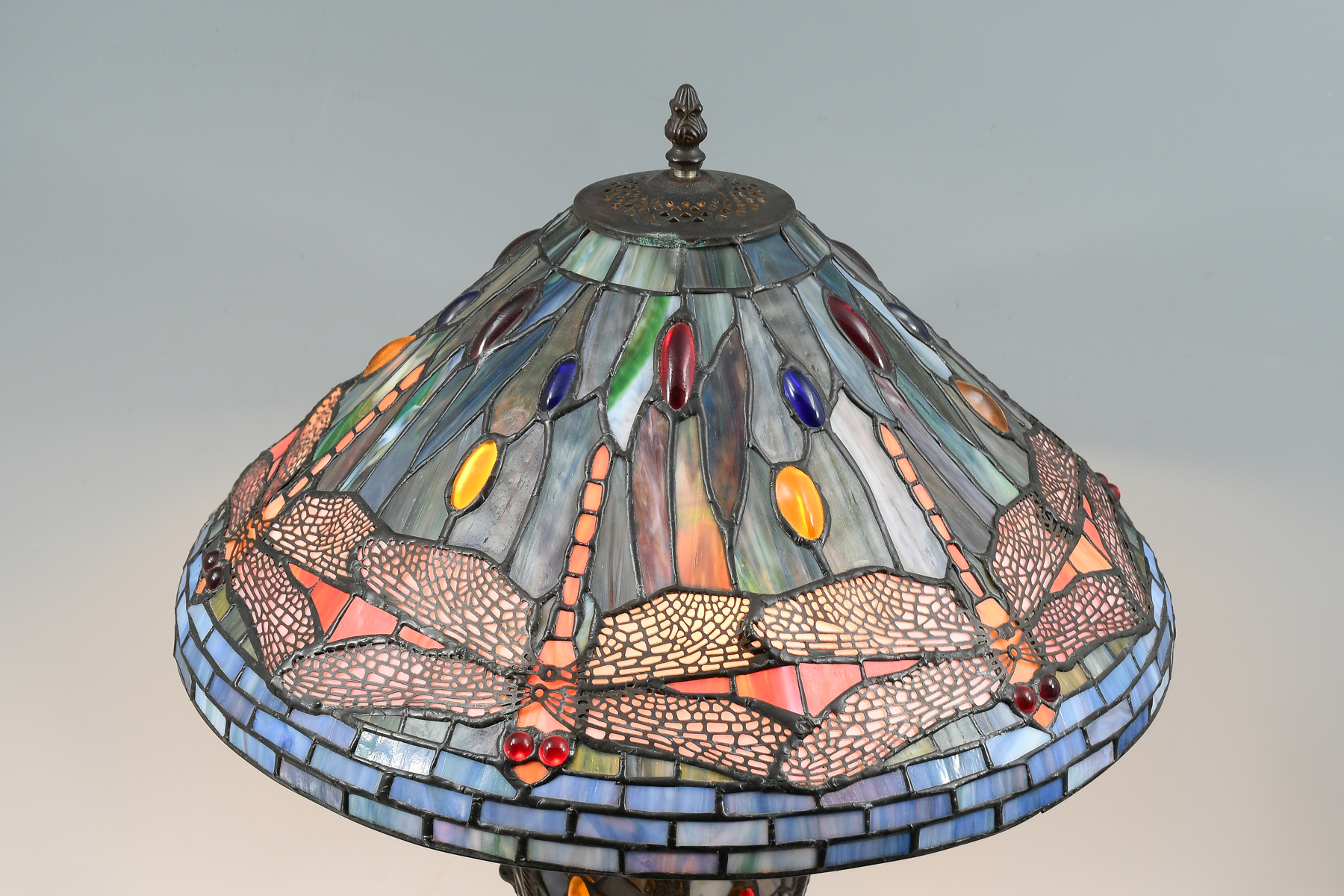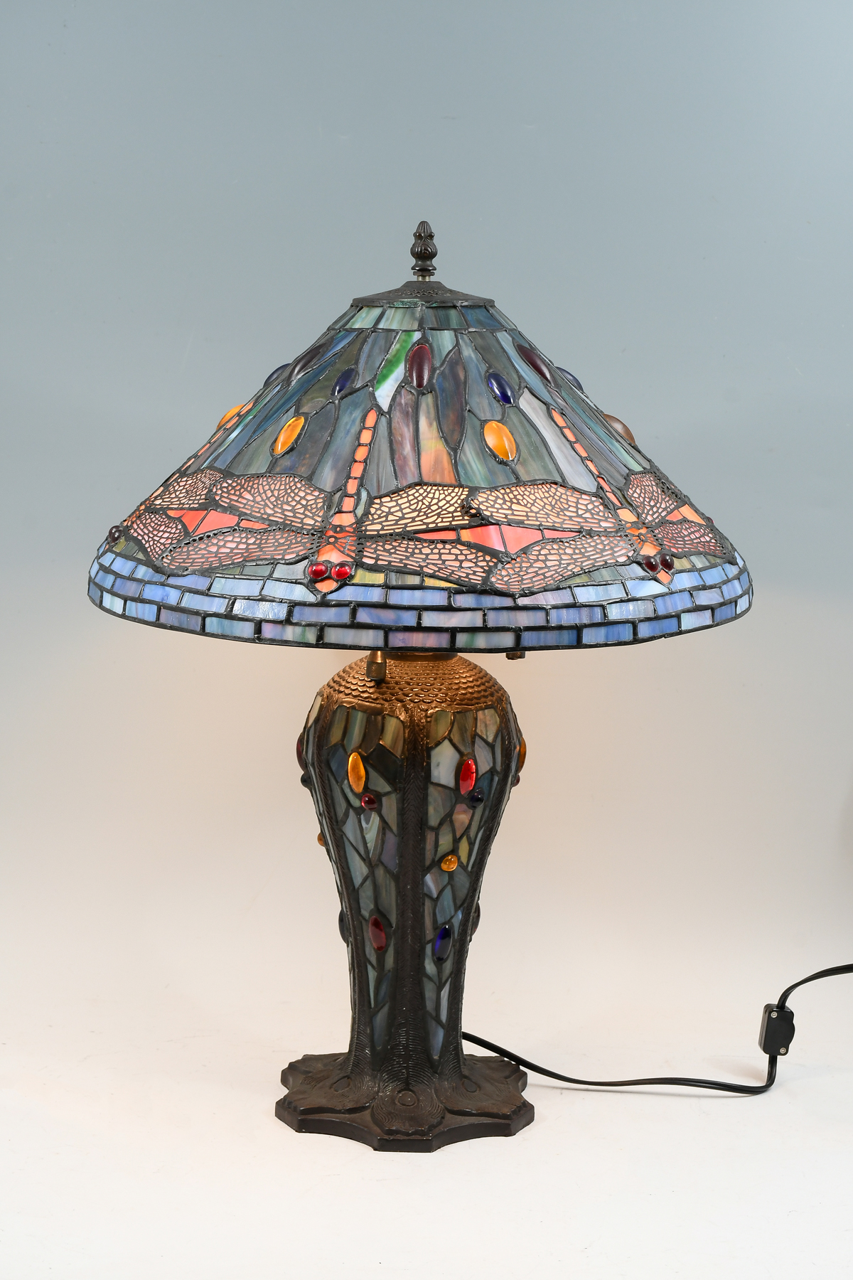 DRAGONFLY MOTIF STAINED GLASS LAMP: With an illuminated leaded glass & cast metal peacock feather motif base surmounted by conical stained & leaded glass shade having an encompassing filigree dragonfly design & raised, polished glass cabochons. Triple chain-pull sockets. Approx. 25.5'' h with a 18.5'' diameter shade and 7.75'' dia. base.