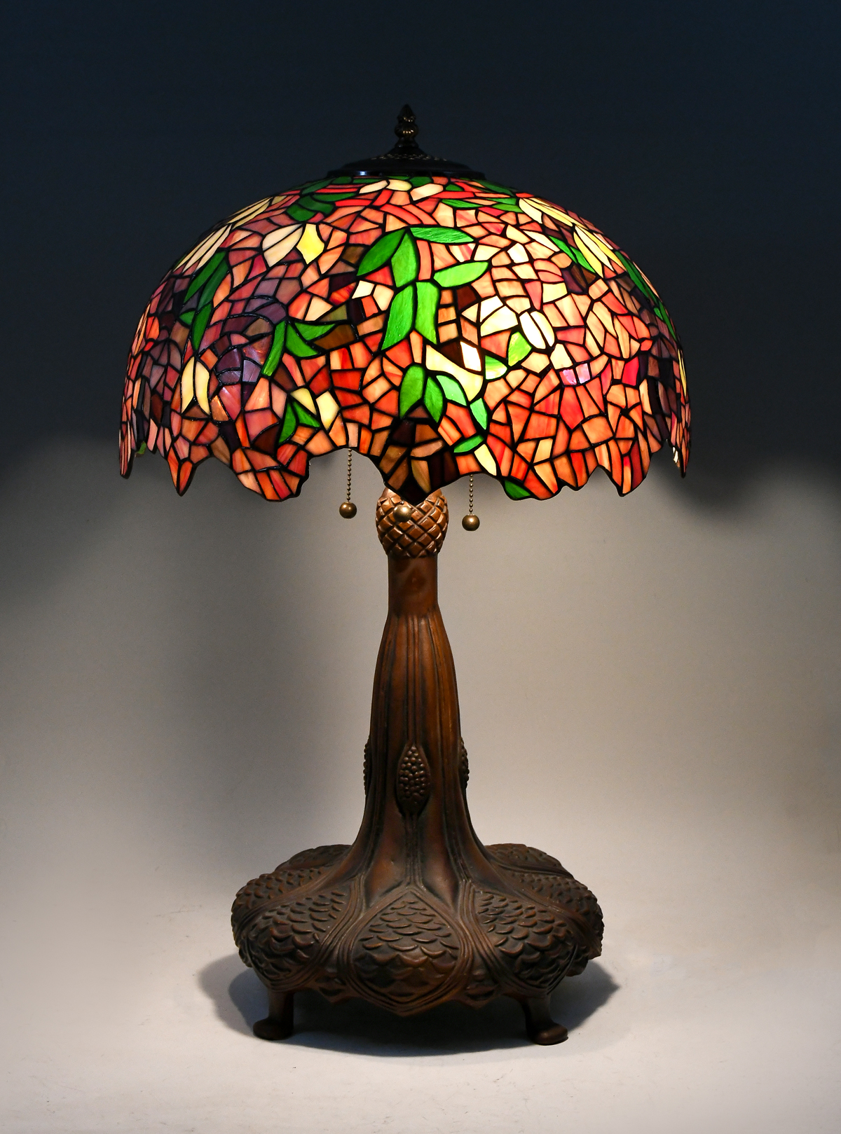 LEADED GLASS LAMP WITH PATINATED FOLIATE MOTIF BASE: A large leaded glass dome shade having a foliate & floral blossom motif in many shades of pink and green with a scalloped edge. Resting upon a patinated bronze finished cast metal base with four small feet. Triple chain-pull sockets and an additional roll-switch at cord. Approx. 29'' h. with a 13'' diameter base. The shade approx. 18'' in dia.