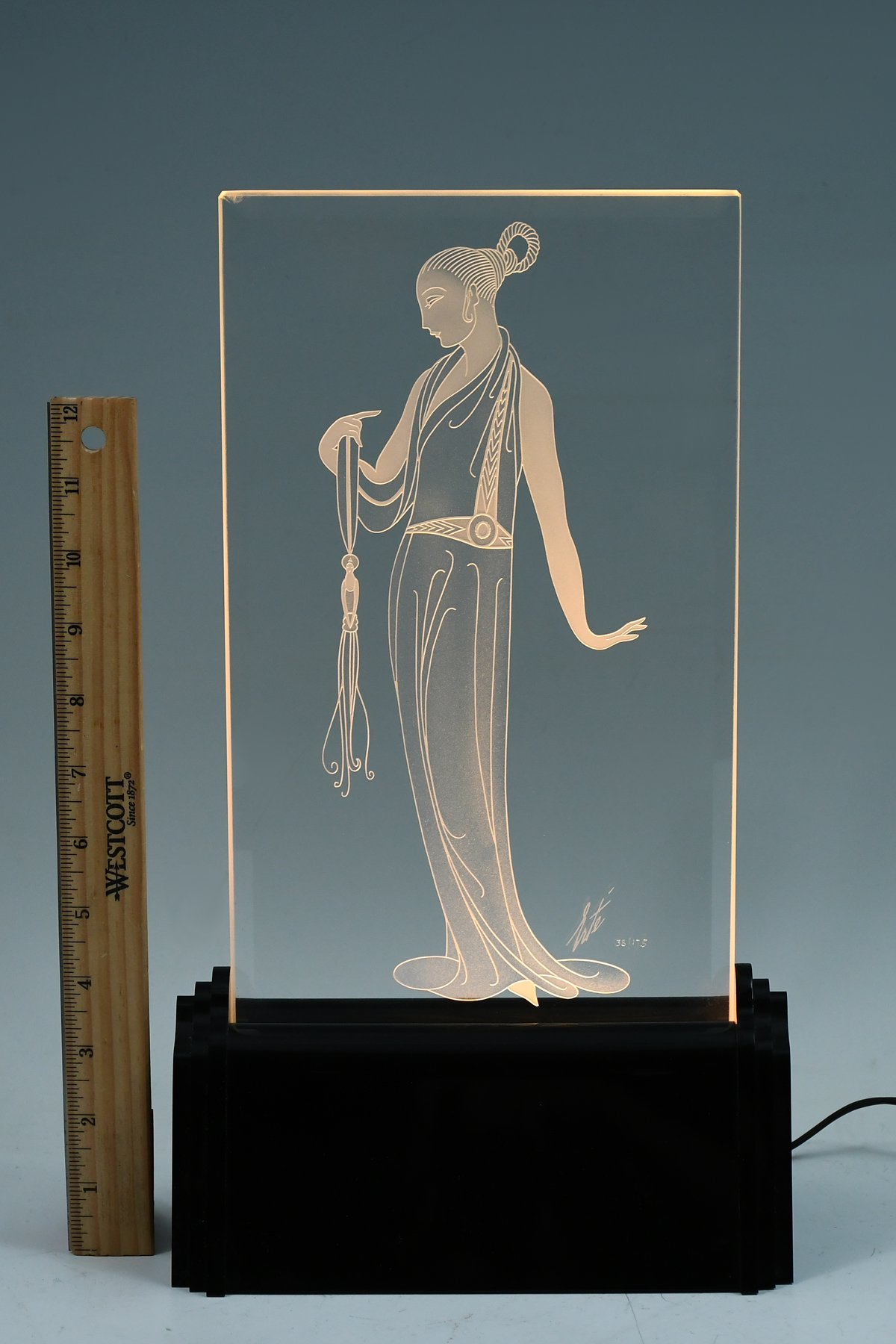 ERTE ART DECO LUMINAIRE: Etched glass insert with Deco Woman in Formal Evening Gown, inserted into lighted base, 15'' x 8.5'', signed and numbered 38/175.