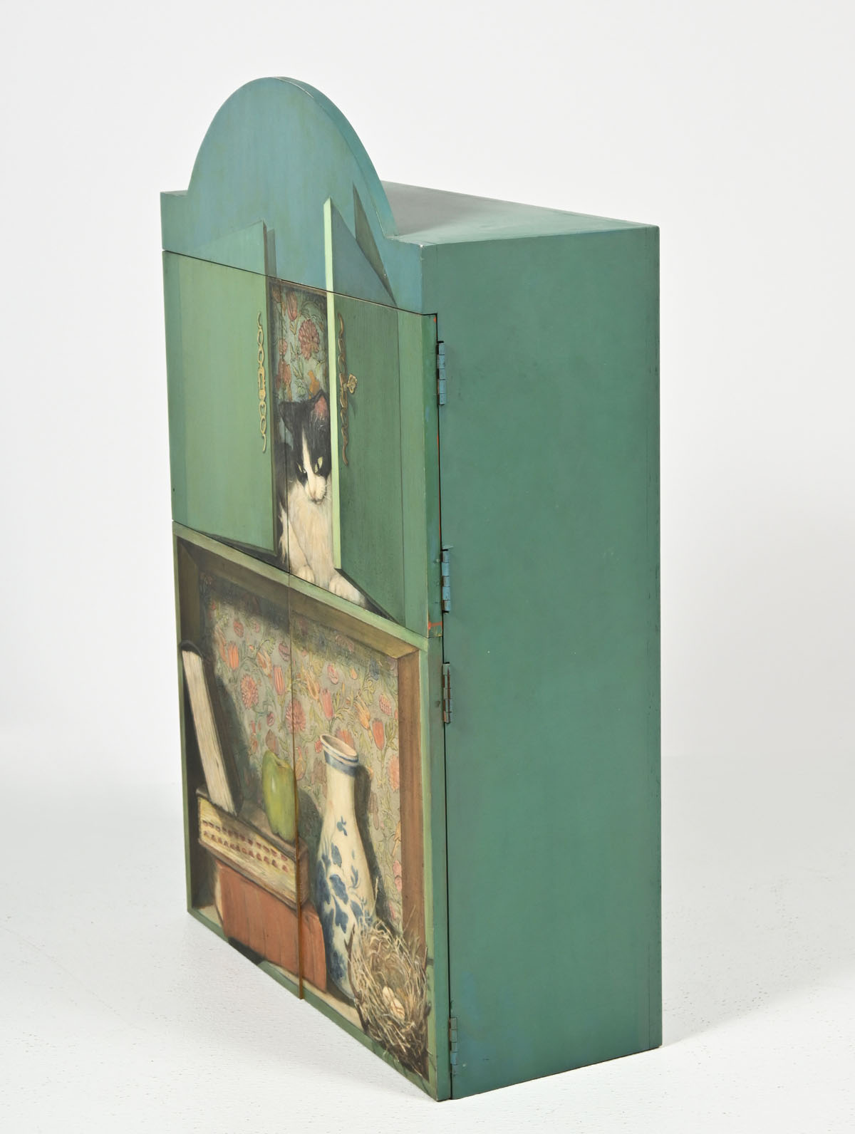 TROMPE L'OEIL KITTEN & STILL LIFE PAINTED CABINET: This charming arch-top Trompe L'Oeil cabinet features a finely painted cat still life scene. Its four doors have magnetic closures, and inside are two tiers of shelving with paper lining that matches the trompe l'oeil exterior. Approx. 30.25'' h x 19'' w x 8'' d.