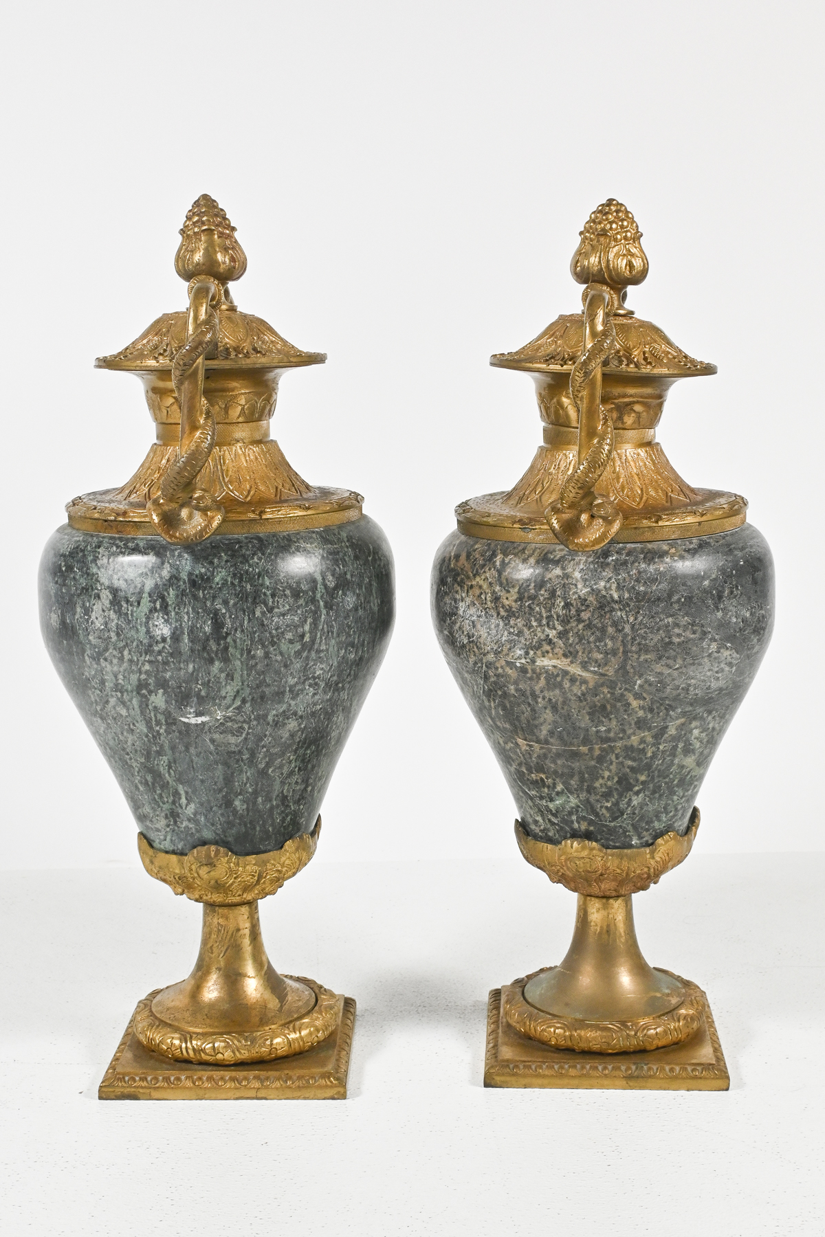 PAIR BRONZE & MARBLE URNS: A pair of gilt bronze mounted urns with green marble bodies. Each on a detailed square base with snake wrapped handles and grape bunch finials. Approx. 28'' h. x 14'' w. x 11'' d.