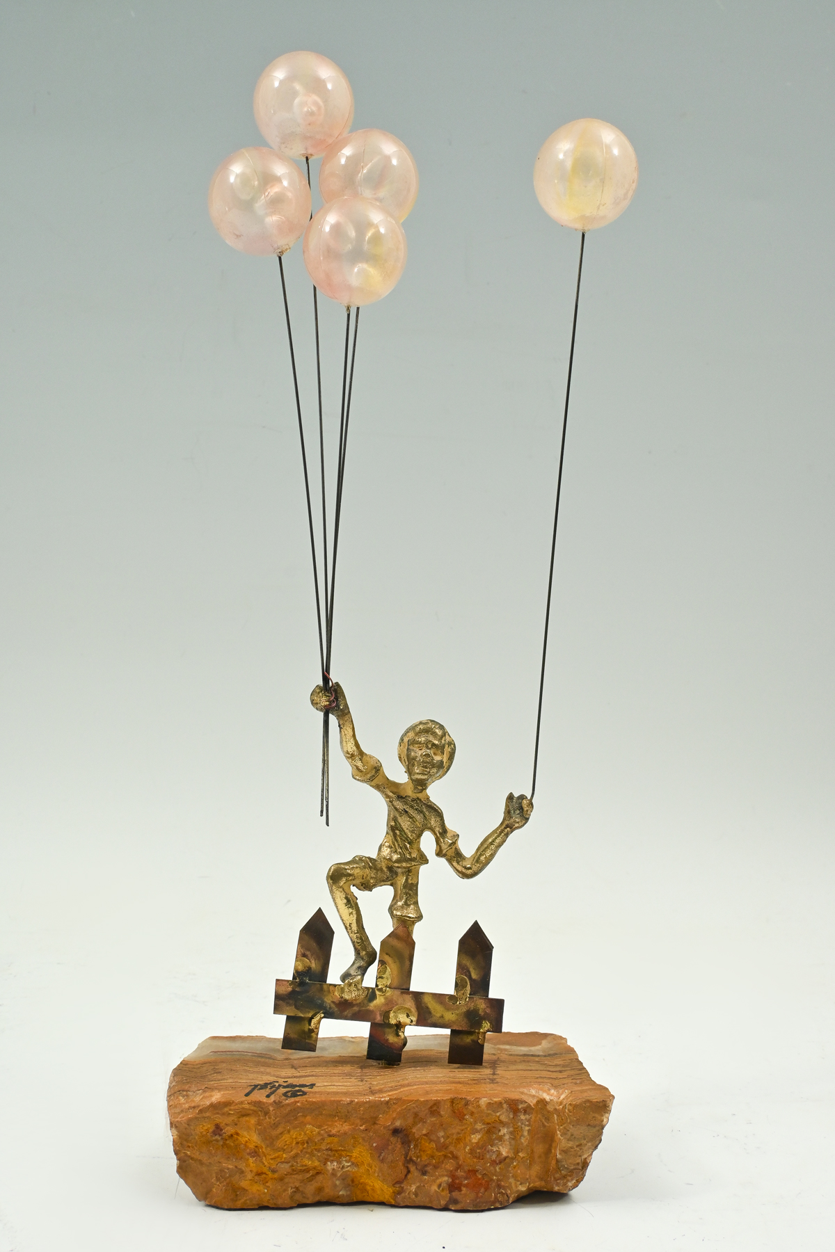 THREE MINIATURE SCULPTURES: Mixed media with Brass, Bronze, Marble and Copper. Two are signed G. Rosenthal, (5'' h., 4.25'' h.) and one, the balloon boy, is illegibly signed, 14.25''.