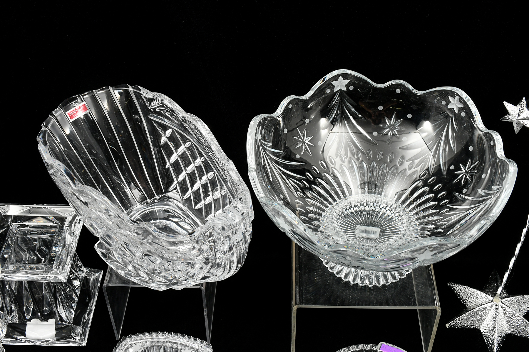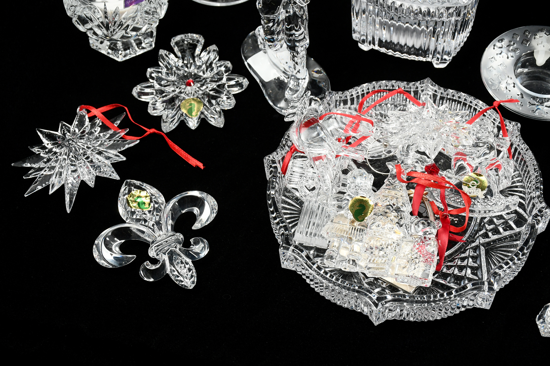 WATERFORD CRYSTAL CHRISTMAS THEME COLLECTION: A wonderful variety of Waterford including many holiday pieces, comprising: 1- Silent Night snowflake music box, 1- Sled, 2- Bells, 1- pair of Snowflake votives, 3- assorted votives in boxes, 1- Silver nativity ornament, 7- Crystal ornaments, 1- Oversize globe ornament, 1- Holiday tray, 1- Three piece Train & Carriages ornament set in box, 1- Fleur-de-lis ornament in box, 1- Snowflake ornament in box, 1- silver tone ornament stand, 1- pair of Newberry votives in box, 1- Seahorse brooch/pin, 1- Pair of Quad Prim candleholders that can be turned over for use as vases, 2- pairs of candlesticks, 1- Pedestal three-leg candle stand, 1- Rooster figure, 1- Golfer figure, and 4- Astor shot glasses.