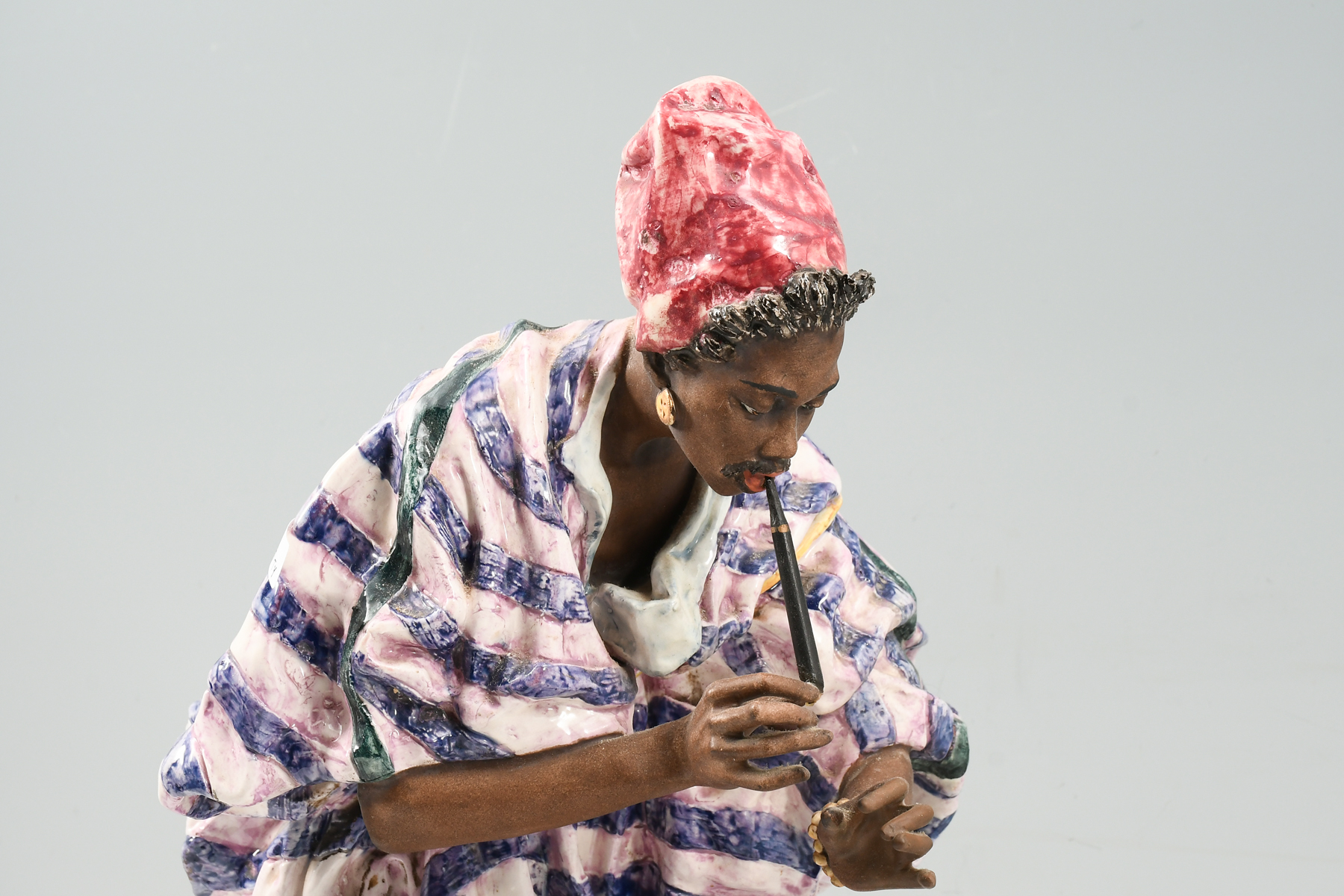 LARGE CERAMIC SNAKE CHARMER SCULPTURE: A polychrome decorated ceramic figure depicting an Egyptian Snake Charmer, after Arthur Strasser. The robed figure holding pungi instrument in hands while bowed over a carved wooden basket. With impressed numbers and single firing hole at base. Approx. 20'' h x 9'' w x 12'' d.