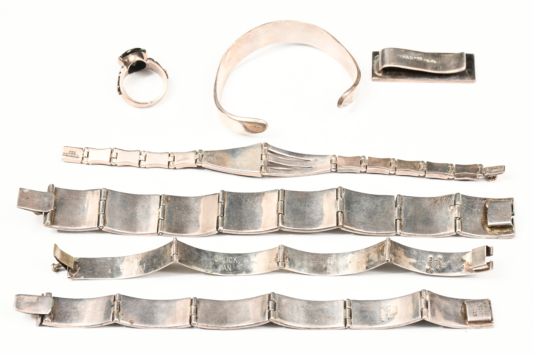 MEXICAN SILVER JEWELRY LOT: 7 pieces of Mexican sterling silver jewelry, including three stone inlaid hinged link bracelets, two with Taxco, Mexico marks. Measuring 7-7.5'' in length. Accompanied by Taxco inlaid stone cuff, approx. 2.5'' w, and Taxco money clip, 1.75'' l x .5'' w. Also included are two pieces of sterling & onyx jewelry. The hinged link bracelet (unmarked) measures approx. 7'' in length. The ring with triangular mark inside, mounted with faceted onyx stone, size 8.