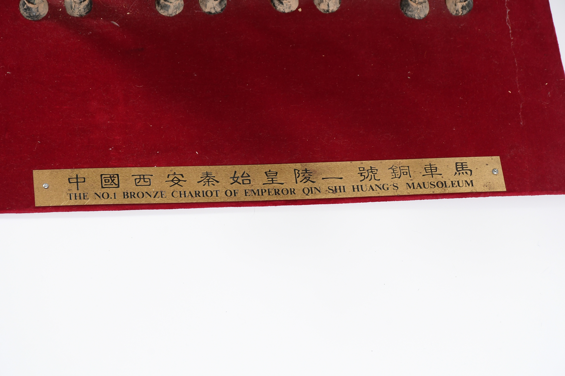 MINIATURE OF EMPEROR'S NO.1 BRONZE CHAIRIOT: Chinese model of Emperor Qin Shi Huang's bronze chariot, a miniature replica of the lifesize original found in the Emperor's mausoleum, depicting four horses with gilt metal bridles and accessories, pulling a covered chariot. Approx. 16.25'' h. x 35.5'' l. x 20.5'' w.