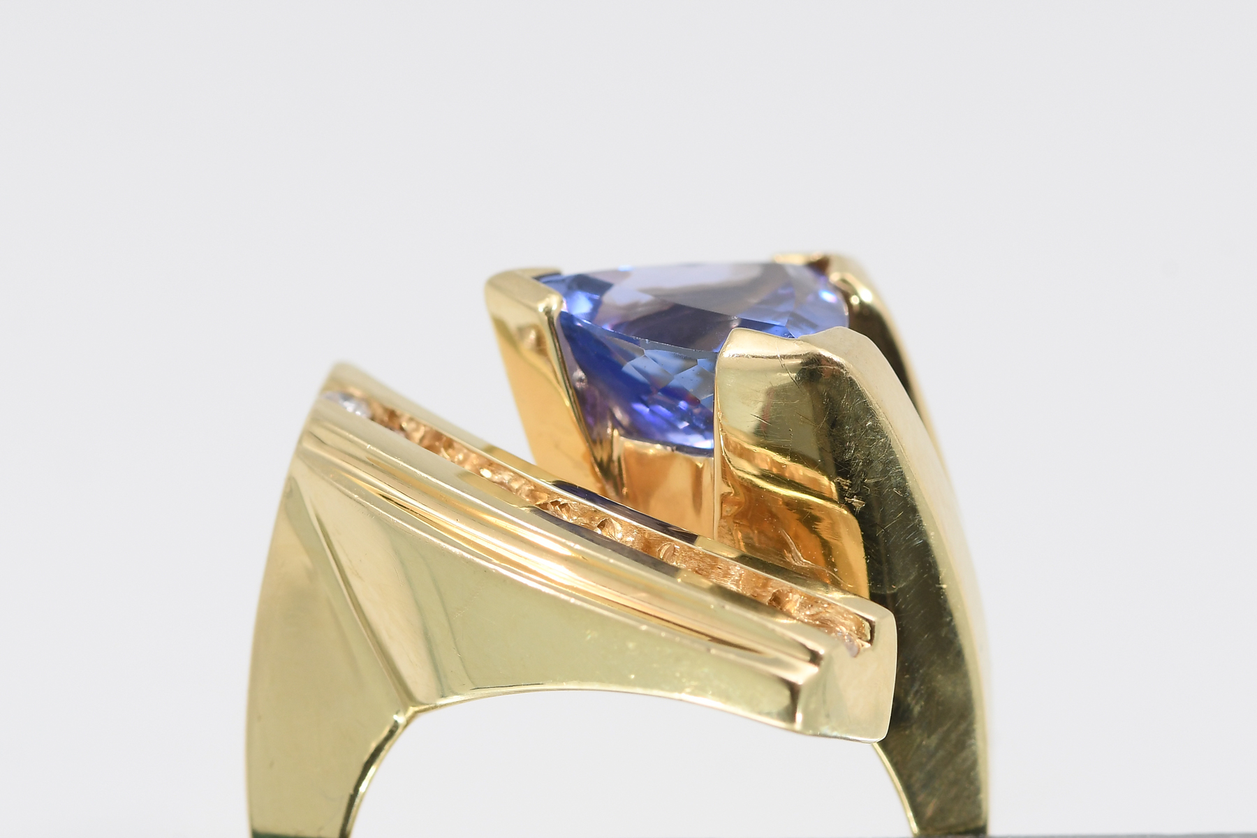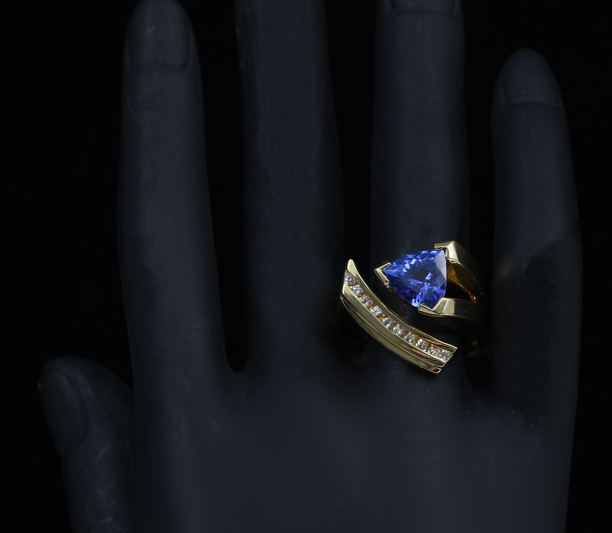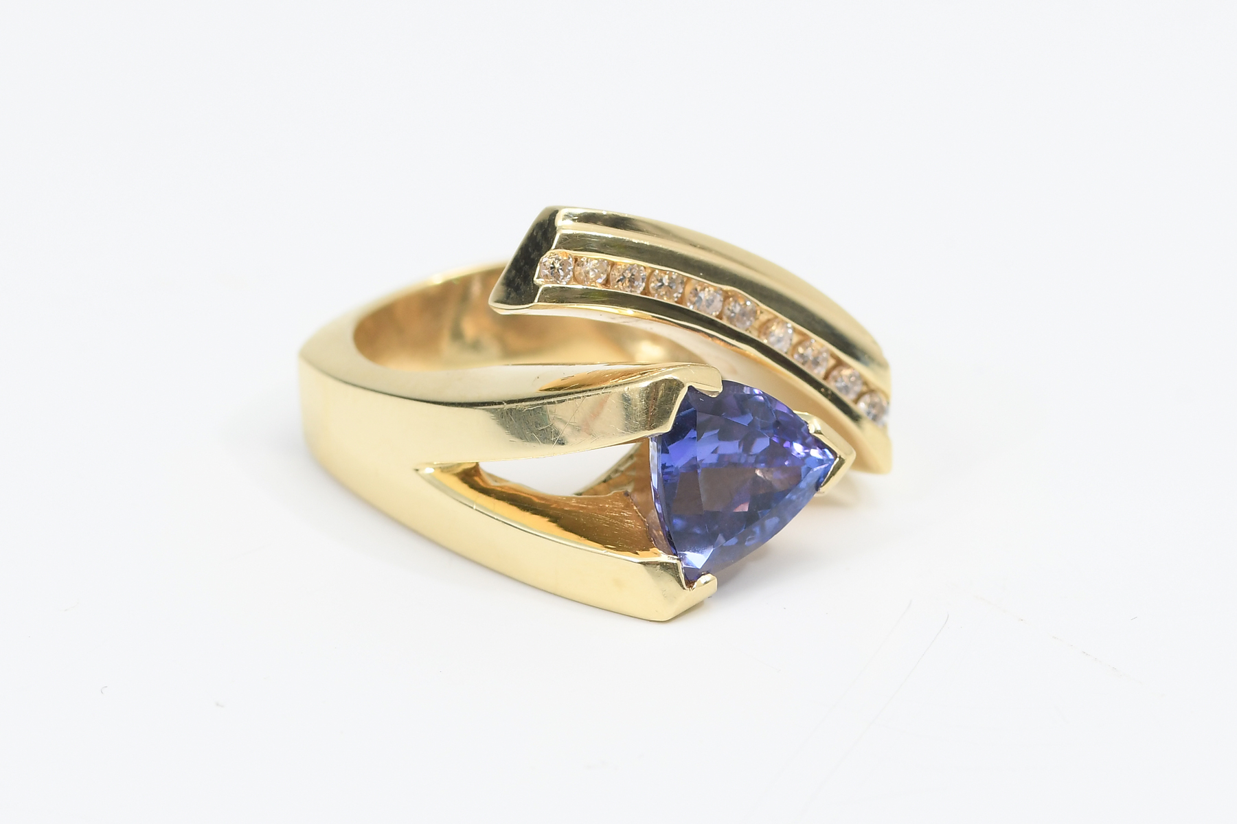 MODERN TANZANITE AND DIAMOND TRILLION CUT RING: An 18K yellow gold, tanzanite, and diamond ring. Showcasing a stunning ''trillion-cut'' / triangle cut tanzanite stone weighing approx. 2.90 ct. Rated VVS in clarity (Type I), bV in Hue, 6 in Tone, and 4-5 in Saturation. Set in the band are ten round brilliant cut diamonds weighing approx. .25 ct. Rated VS in clarity and G-H in color. The tanzanite is prong set; the diamonds are channel set. Size 6.75/7; weighs a total of 20.8 gms. Sold with a current Florida Diamond Appraisers GIA graduate's appraisal for $8,350.00. Est. $7000/9000**