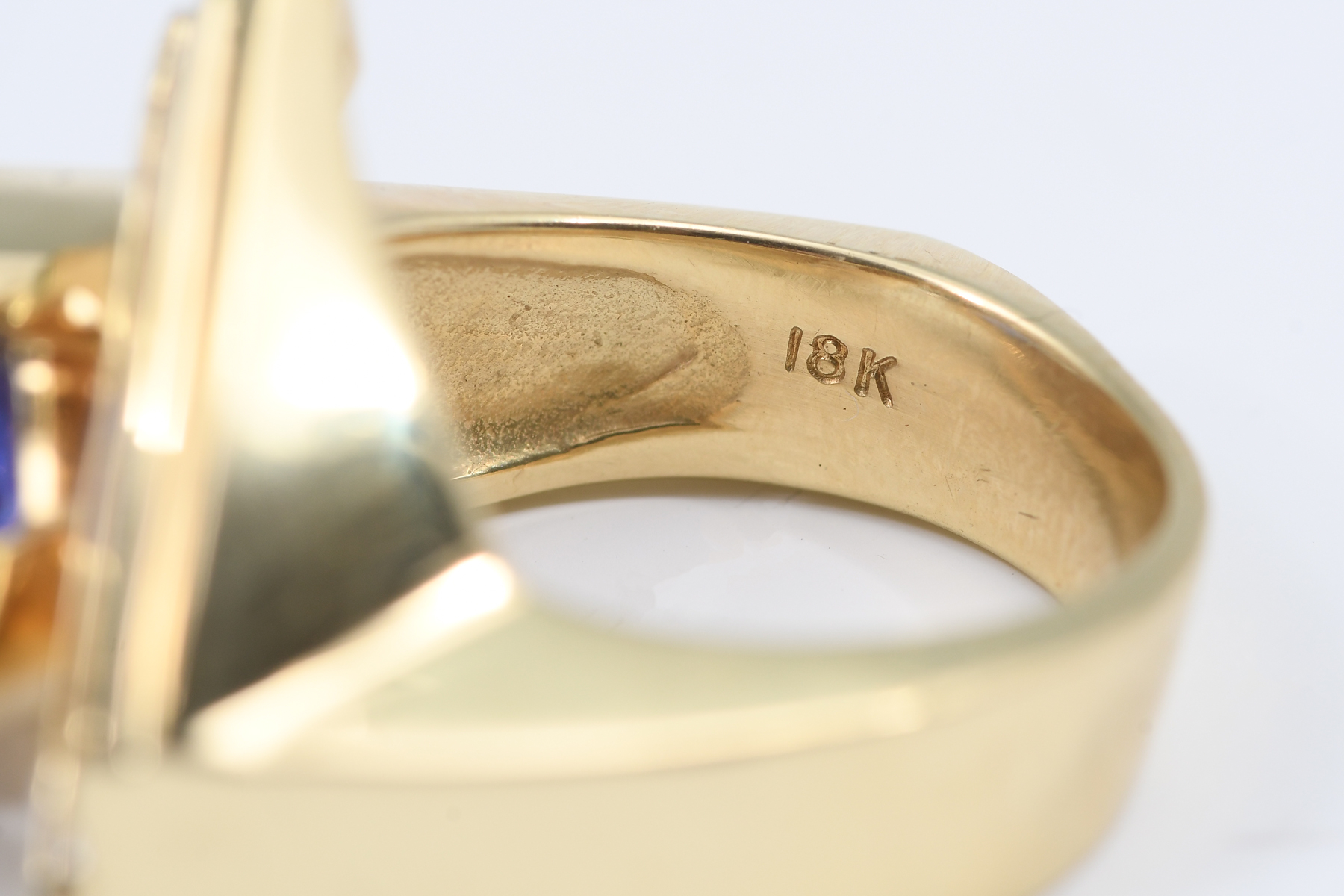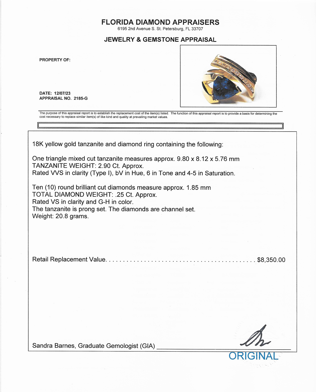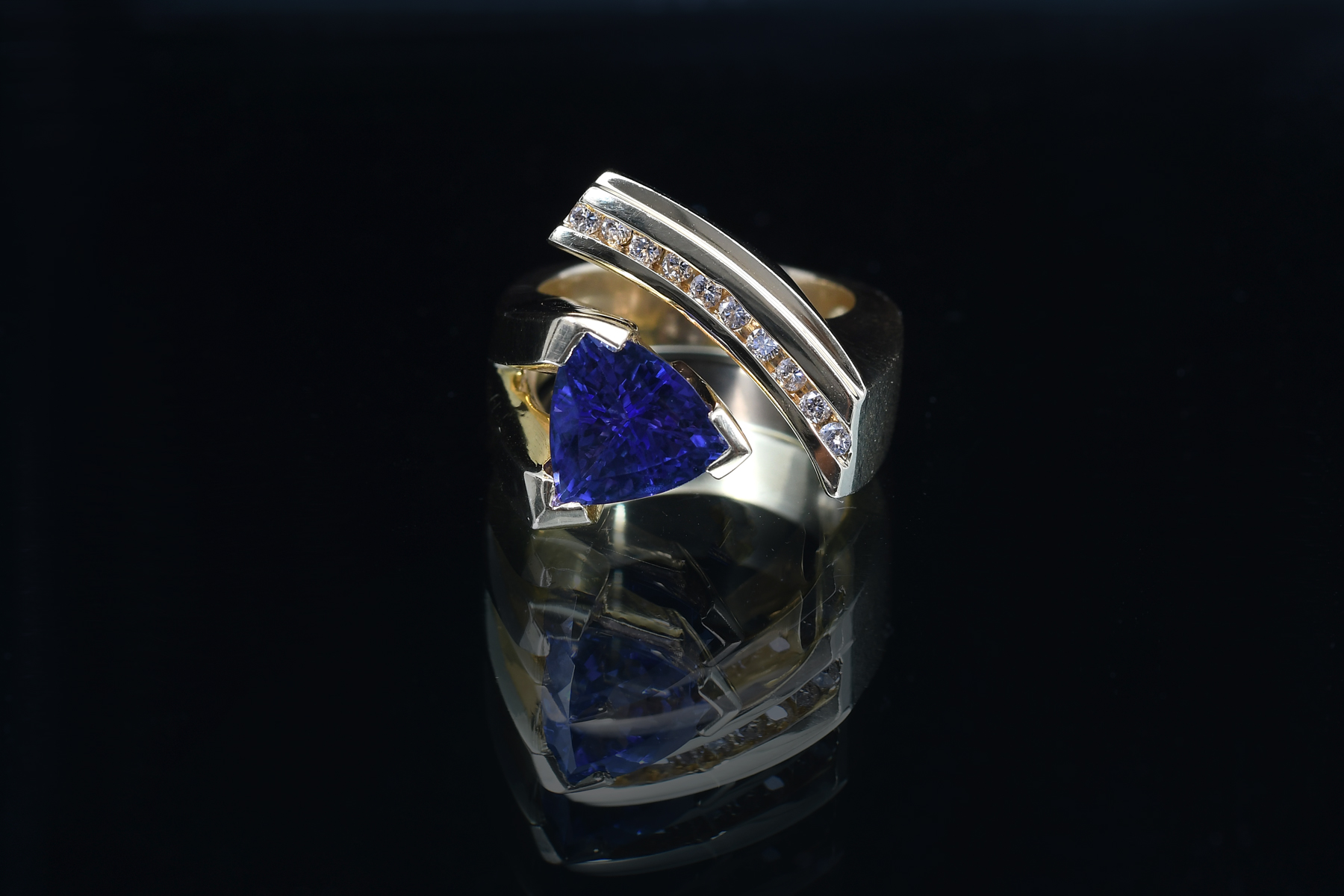 MODERN TANZANITE AND DIAMOND TRILLION CUT RING: An 18K yellow gold, tanzanite, and diamond ring. Showcasing a stunning ''trillion-cut'' / triangle cut tanzanite stone weighing approx. 2.90 ct. Rated VVS in clarity (Type I), bV in Hue, 6 in Tone, and 4-5 in Saturation. Set in the band are ten round brilliant cut diamonds weighing approx. .25 ct. Rated VS in clarity and G-H in color. The tanzanite is prong set; the diamonds are channel set. Size 6.75/7; weighs a total of 20.8 gms. Sold with a current Florida Diamond Appraisers GIA graduate's appraisal for $8,350.00. Est. $7000/9000**