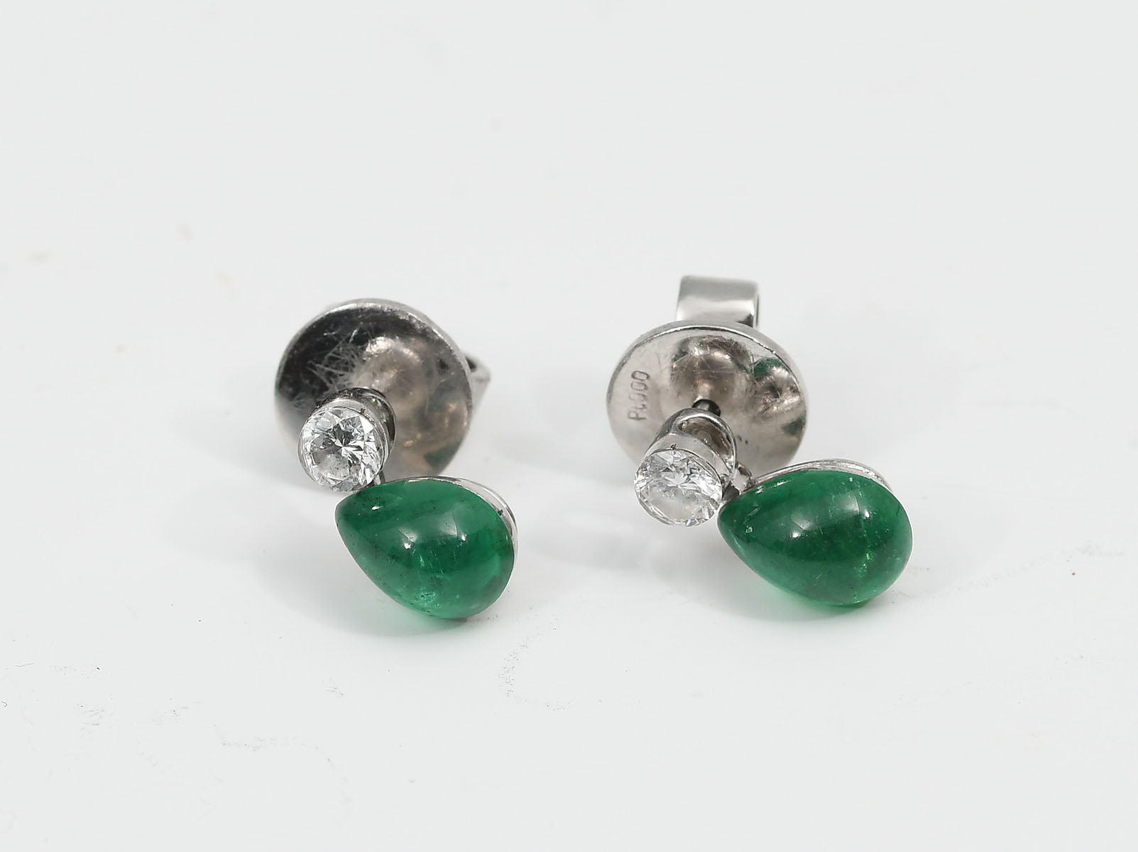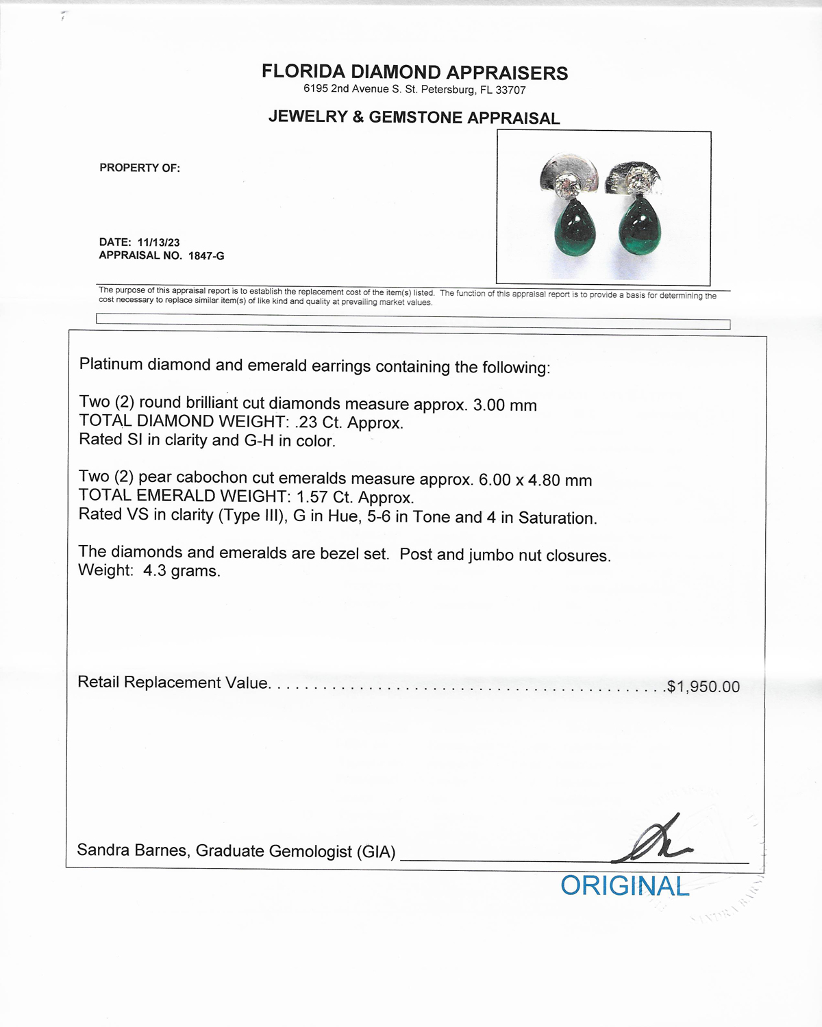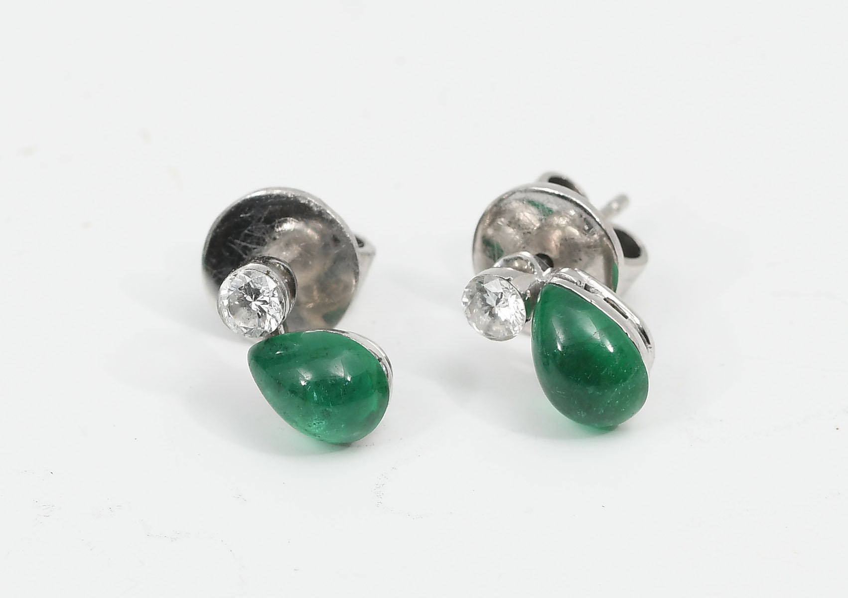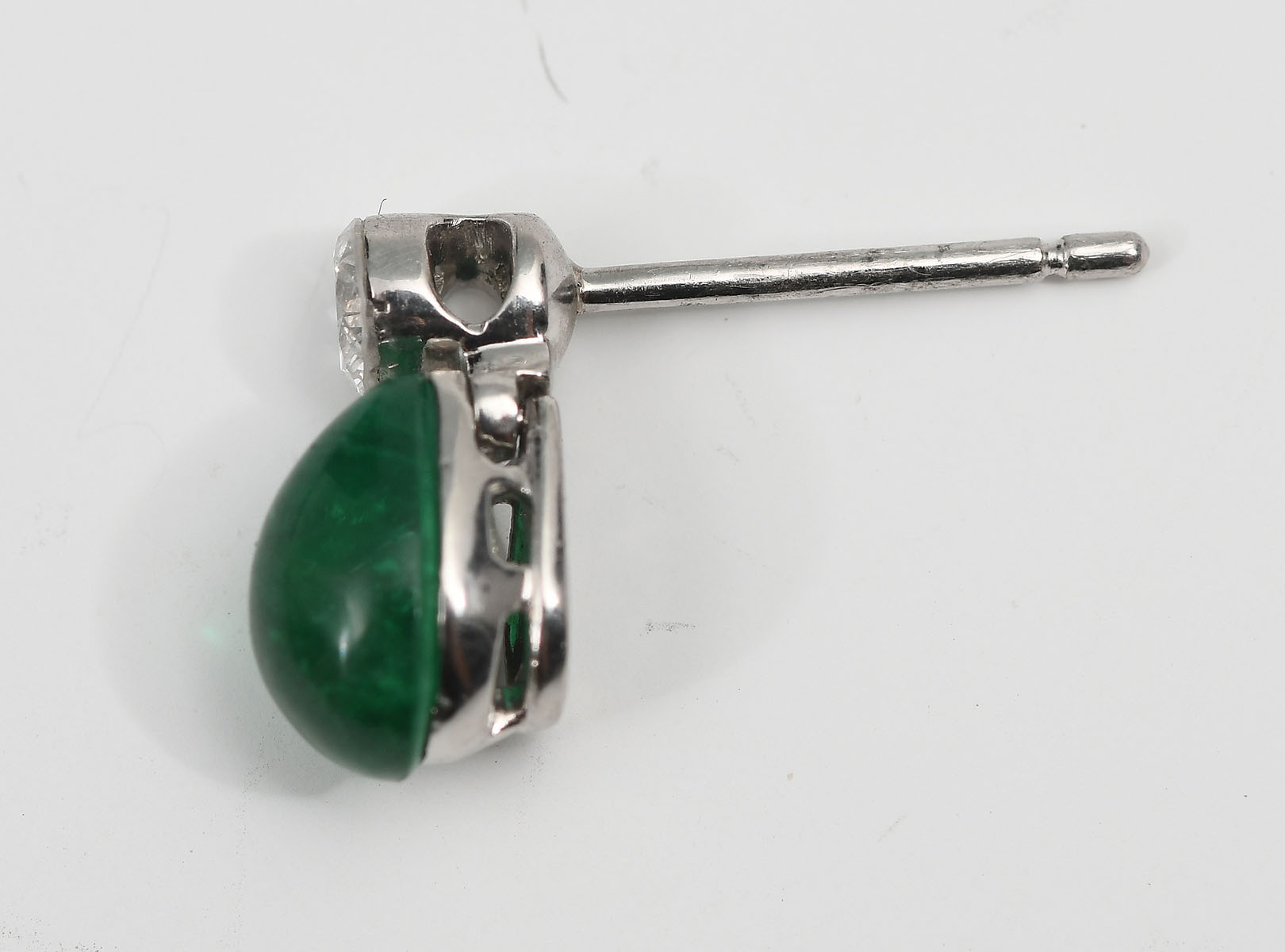 PLATINUM, DIAMOND & EMERALD TEARDROP EARRINGS: A gorgeous pair of earrings showcasing two pear cabochon cut emeralds (approx. 1.57 ct.; rated VS in clarity, G in Hue, 5-6 in Tone, and 4 in Saturation), suspended below two round brilliant cut diamonds which weigh approx. .23 ct., rated SI in clarity and G-H in color. Platinum set with jumbo platinum backs. Total weight is 4.3 gms. Sold with a current Florida Diamond Appraisers GIA graduate's appraisal for $1,950.00. Est. $1000/1200**