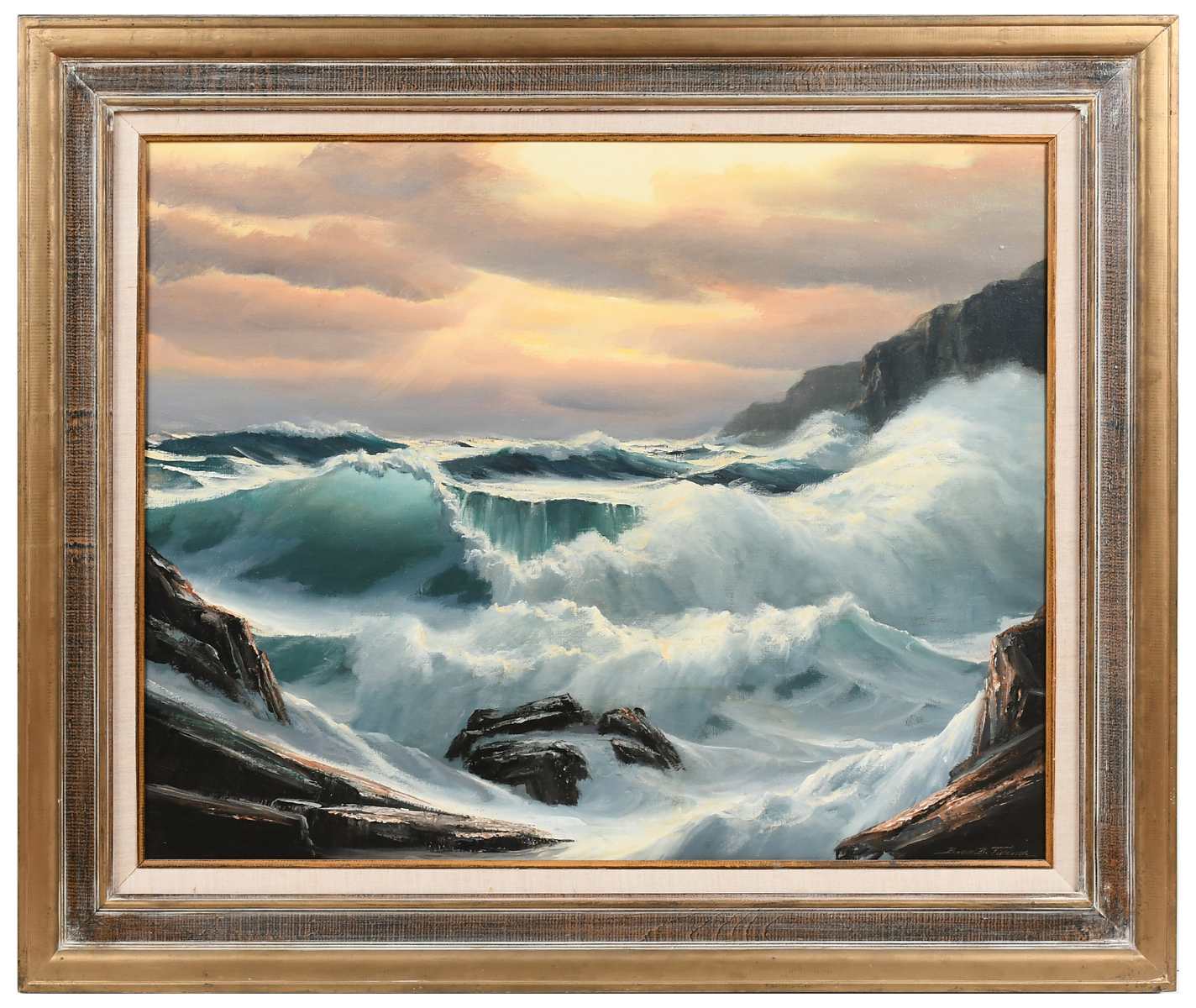 TURNER, Bruce Backman, (American, b. 1941): Coastal Surf Sunrise, Oil/Canvas, 24'' x 30'', signed lower right, original frame, 32'' x 38''. Artist bio affixed verso. Est. $500/800**