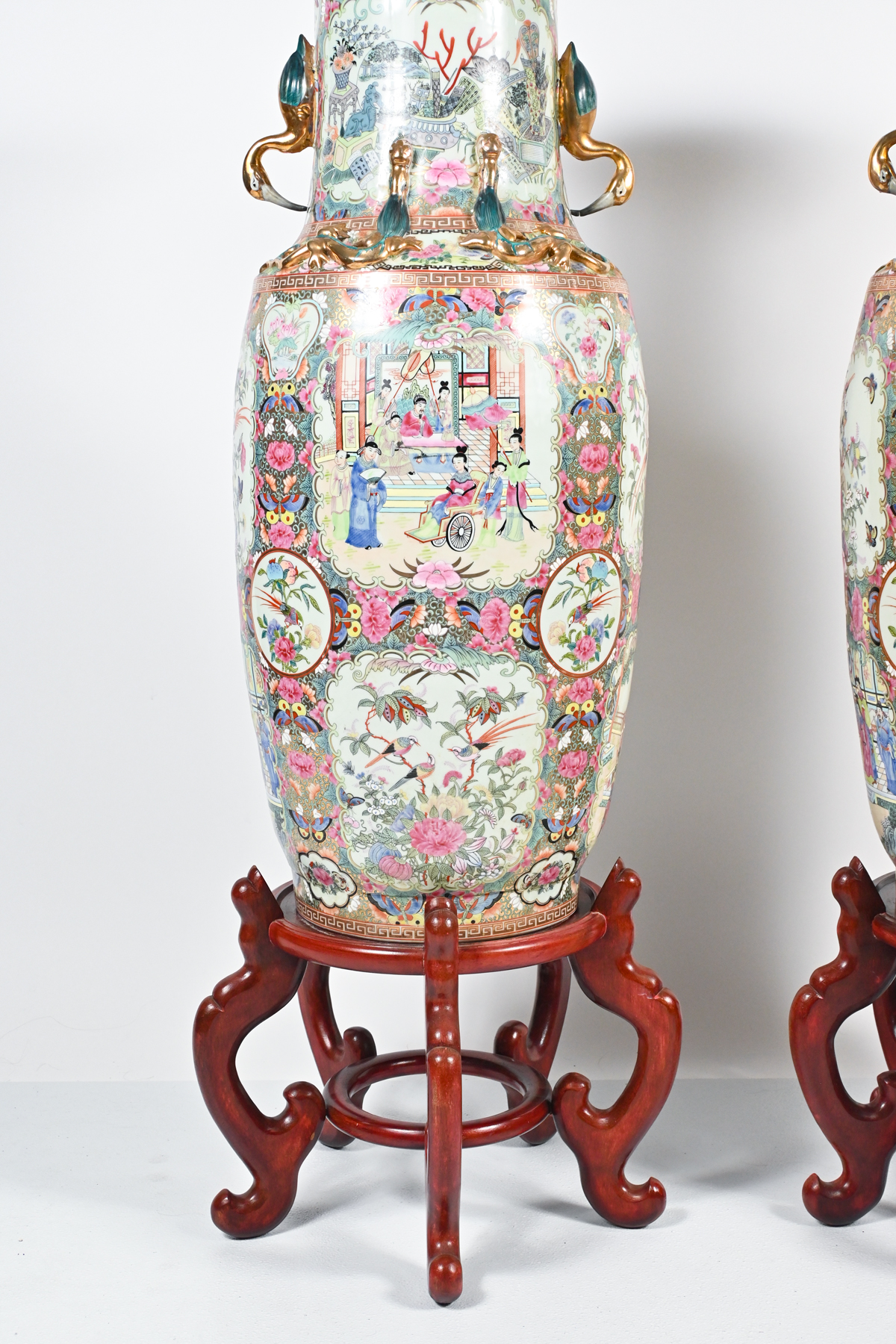 PAIR SUBSTANTIAL CHINESE FAMILLE ROSE FLOOR VASES: A pair of massive Chinese famille rose floor vases profusely decorated w/ polychrome enamel and gilt accents. Baluster form with tapered neck and flared, everted rim; each having twin crane-form handles and four dragons mounted along the shoulders. Approx. 36'' h x 16'' dia. Sold with carved wood floor stands measuring approx. 13'' h x 18'' dia.