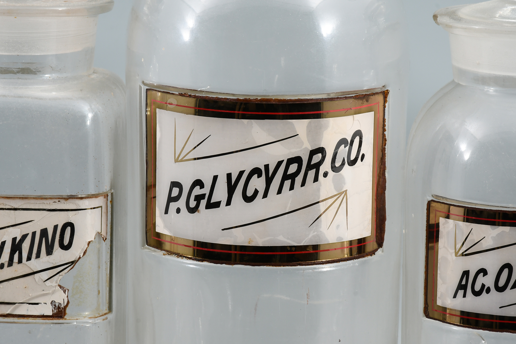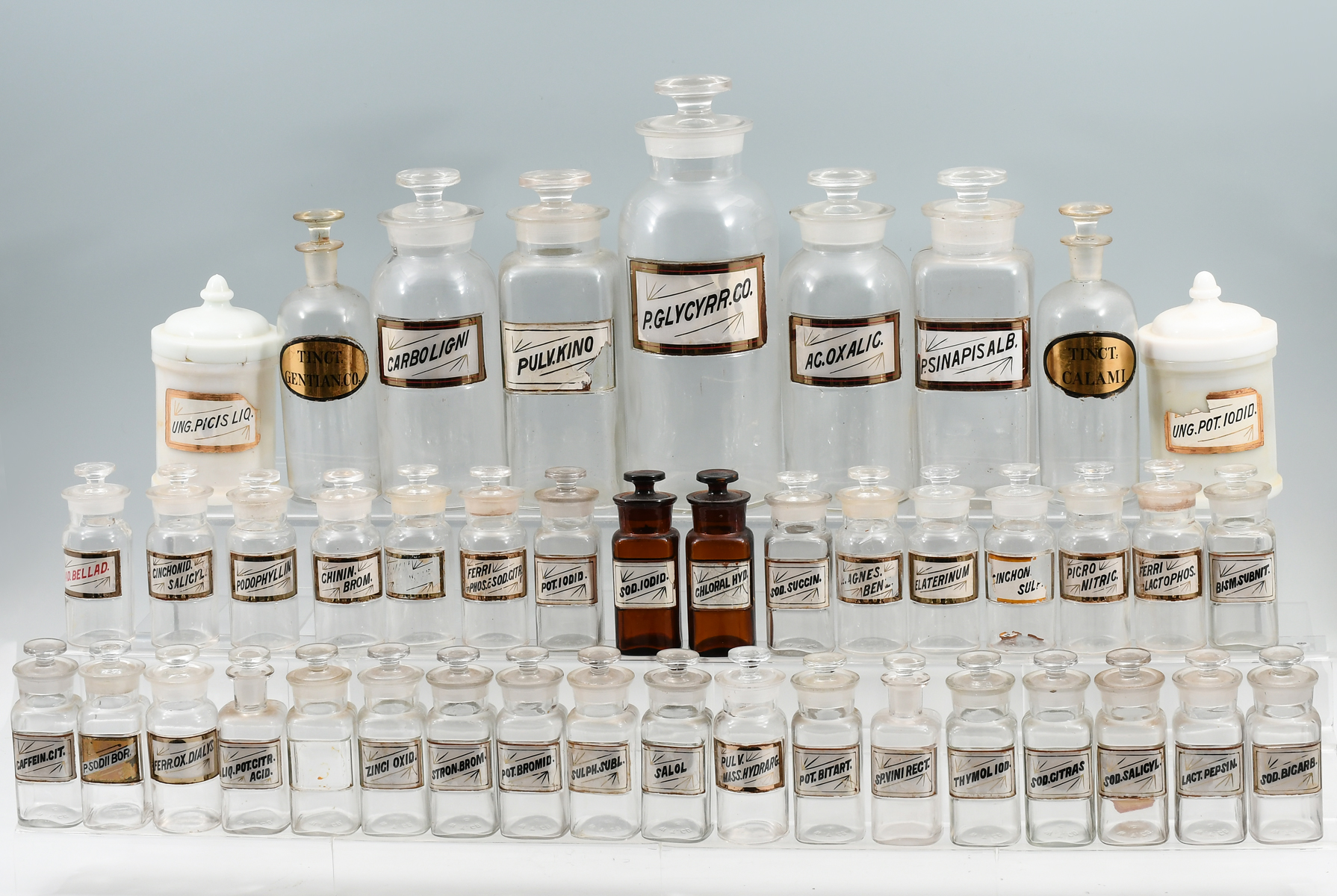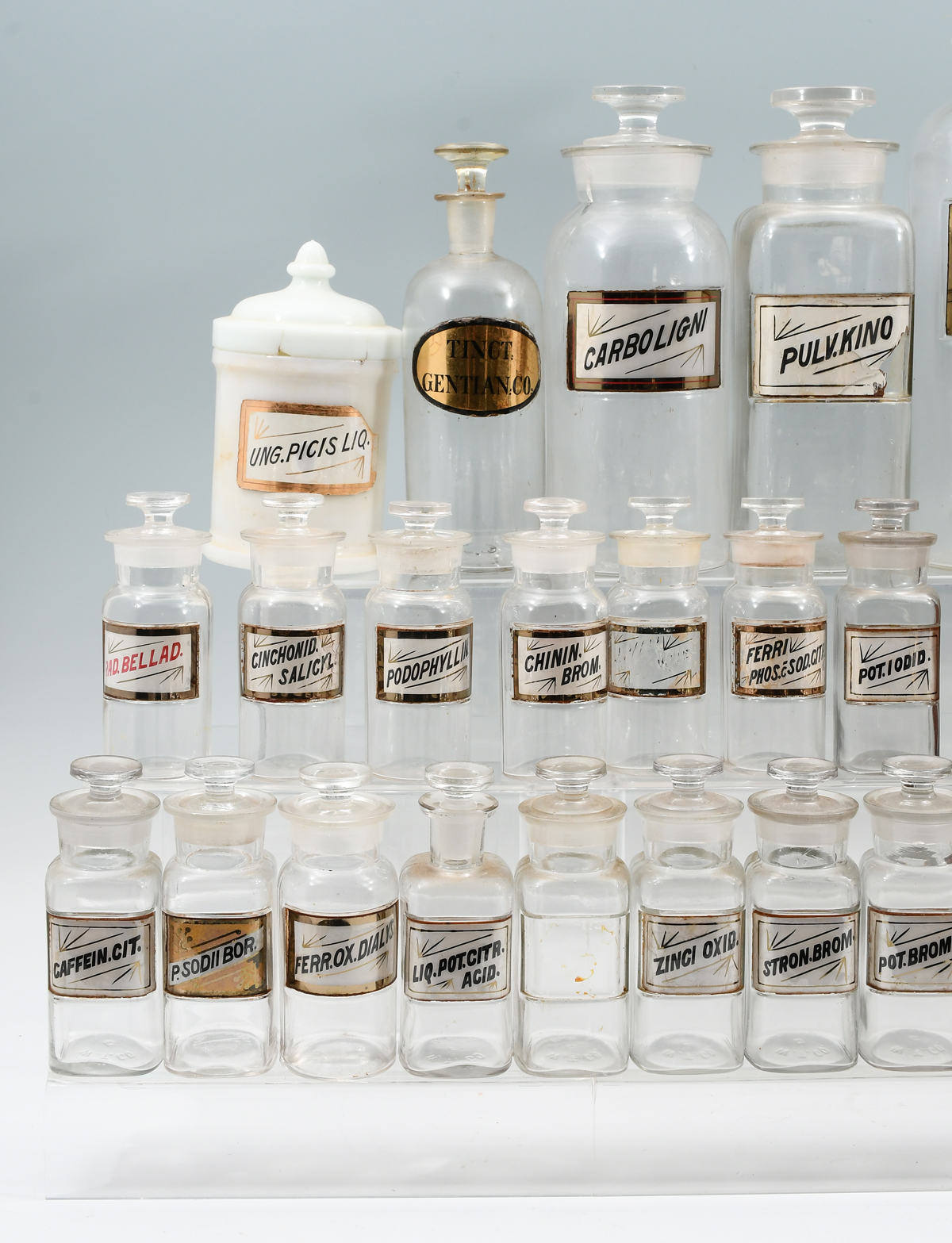 43 PC. DRUG STORE APOTHECARY BOTTLES: A 43-piece collection of druggist's & chemist's apothecary bottles with stoppers and fitted glass plate labels. Mostly clear flint glass, with two amber glass bottles and two milk glass jars included. The majority made by Whitall Tatum Co. (W.T. & Co.) with marks from 1870's onwards. Accompanied by two taller cylindrical unmarked blown glass bottles with gilt labels and pontil marks underneath. The smaller bottles measure approx. 5.25'' in height; the largest approx. 12.25'' h.