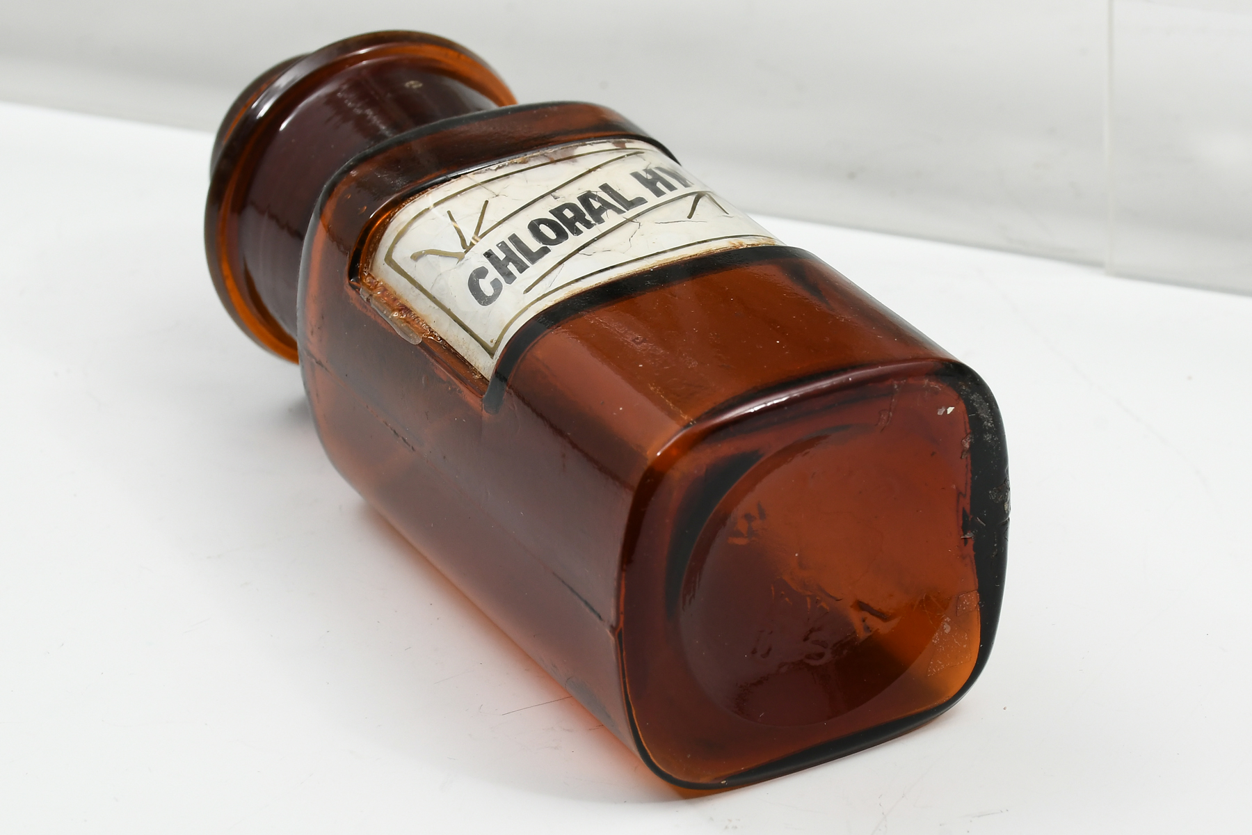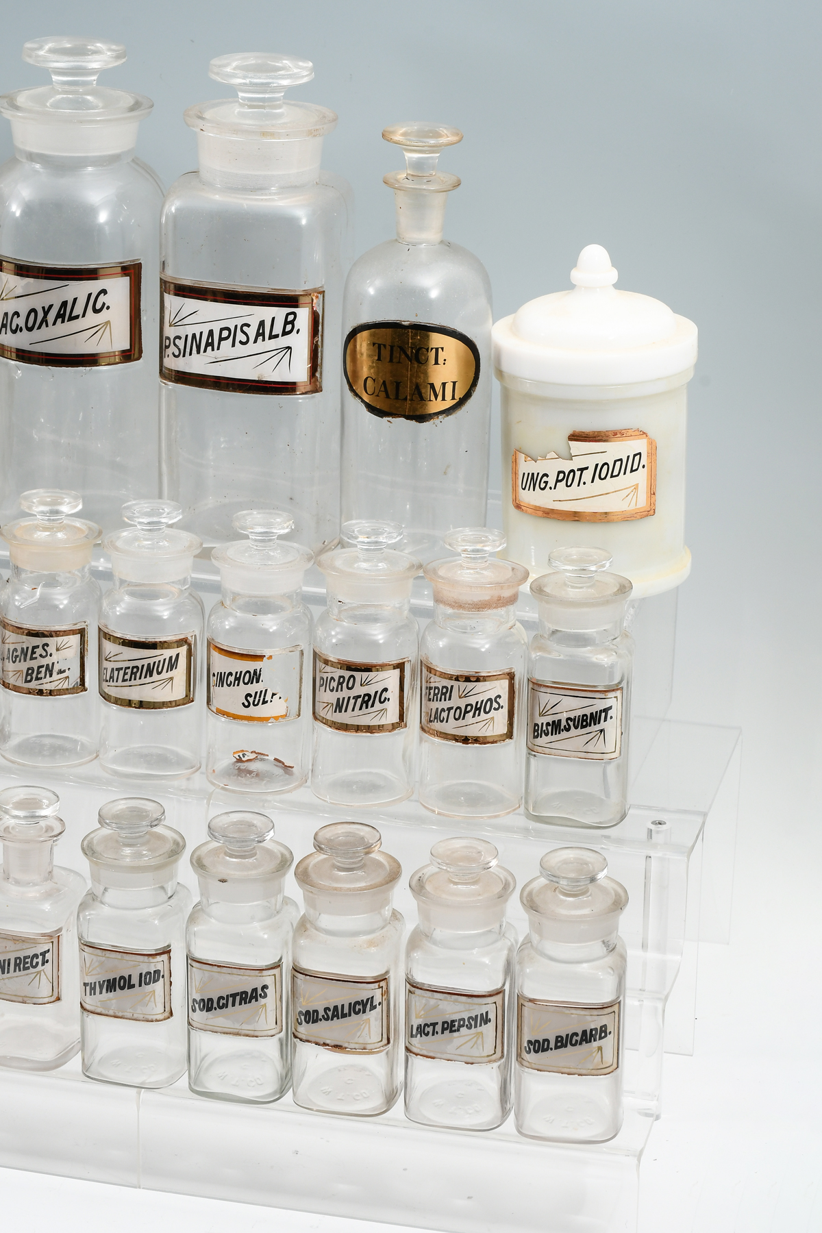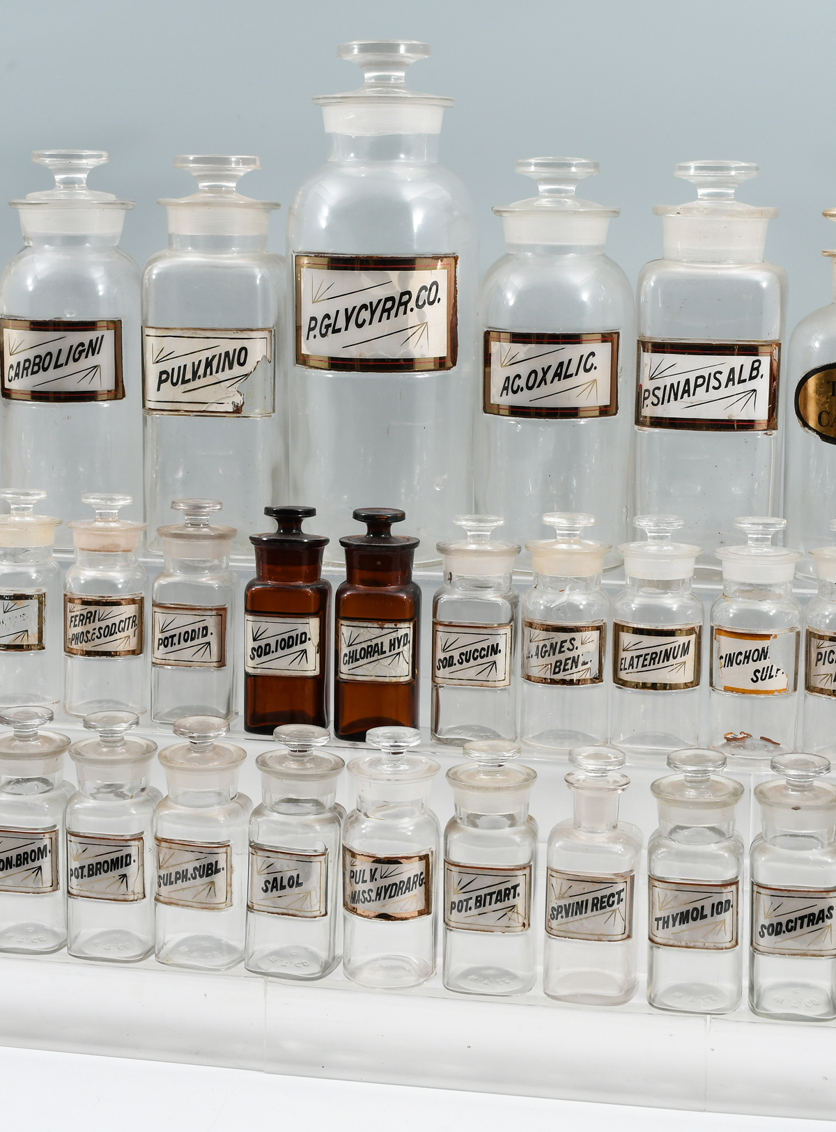 43 PC. DRUG STORE APOTHECARY BOTTLES: A 43-piece collection of druggist's & chemist's apothecary bottles with stoppers and fitted glass plate labels. Mostly clear flint glass, with two amber glass bottles and two milk glass jars included. The majority made by Whitall Tatum Co. (W.T. & Co.) with marks from 1870's onwards. Accompanied by two taller cylindrical unmarked blown glass bottles with gilt labels and pontil marks underneath. The smaller bottles measure approx. 5.25'' in height; the largest approx. 12.25'' h.