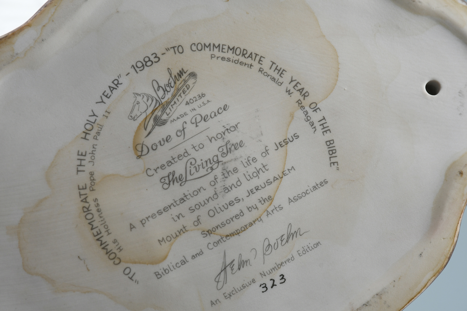 BOEHM PORCELAIN DOVE OF PEACE SCULPTURE: This limited edition Boehm Porcelain figure, the Dove of Peace depicts a white dove taking flight with an olive branch in its beak. No. 323 of an exclusive numbered edition, 1983. Signed by artist. Boehm backstamp. Approx. 13.25'' h x 11'' w x 11'' d.