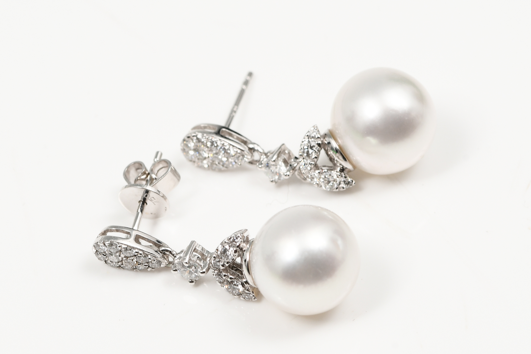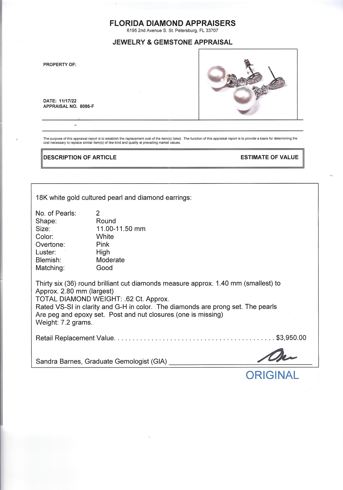 18K WHITE GOLD PEARL AND DIAMOND EARRINGS: Pair of 18K cultured round pearl and diamond earrings. White pearls with a pink overtone and high in luster. There are a total of 36 round brilliant-cut diamonds with the total diamond weight being approx. .62 Ct. One post and nut closure. Total weight is 7.2 grams.