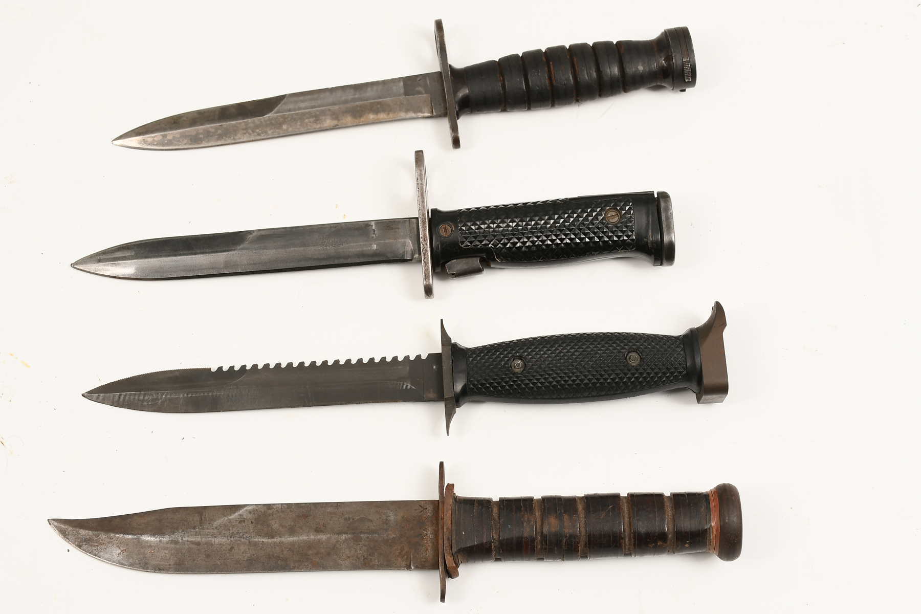 4PC. BLADE LOT: 1) U.S. Columbus Milpar M6 Bayonet Fighting Knife, stamped identifying marks on the crossguard, blade measures 6.5'', comes with metal scabbard stamped ''US M8A1'' and ''PWH'', overall length 13''; 2) U.S. Imperial M4 Bayonet, stamped identifying marks on the crossguard, blade measures 6.5'', with sheath, overall length 12.875''; 3) U.S. Navy PAL RH37 Fighting Knife, stamped ''U.S. Navy'' on one side and ''RH 37'' on the other with the PAL logo, blade has a clipped point and measures 6.75'', includes leather sheath with official ''U.S.N'' stamp as well as illegible personalization stamps from a prior owner, overall length 12.75''; 4) Imperial M7 Sawtooth Bayonet, serrated blade measures 6.5'', comes with a camo-pattern survival sheath with two pouches containing a compass, whetstone, matches, and more, overall length 13.25''.
