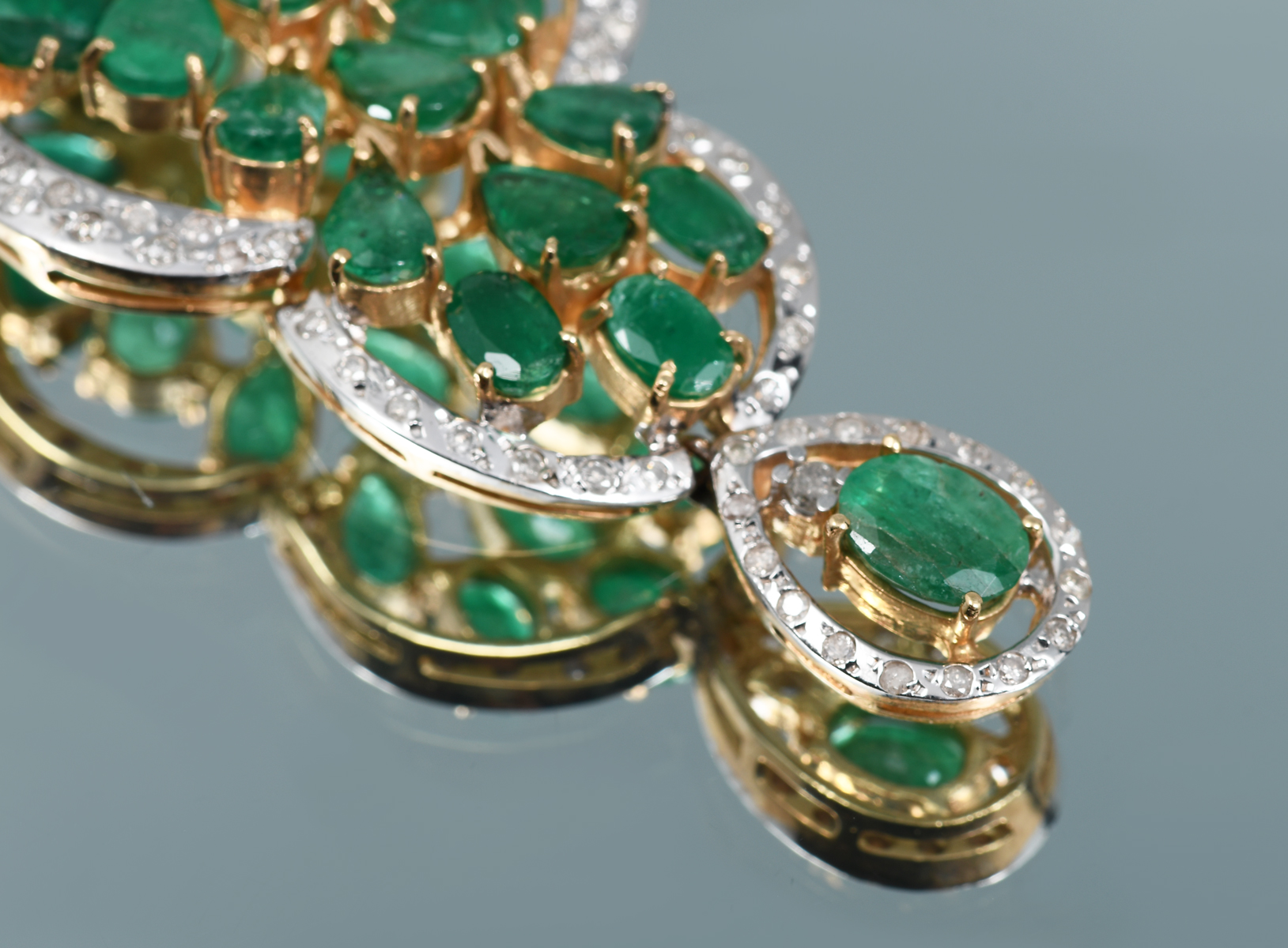 14K YELLOW GOLD, EMERALD, AND DIAMOND NECKLACE: This tiered emerald necklace contains 30 oval and pear, mixed-cut emeralds. Total emerald weight is 22.50 approx. Ct. There are 107 diamonds surrounding the emeralds. The gems are prong and deep set, held up by a 14K chain. Total diamond weight is approx. 1.33 Ct. Total weight 41.4 grams. Sold with current Florida Diamond Appraisers appraisal for $8,950.
