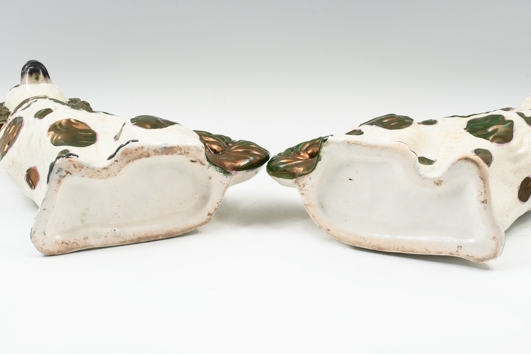 PR. GREEN & WHITE STAFFORDSHIRE PORCELAIN DOGS: Two Staffordshire spaniels with green markings and gold luster highlights. Fine brushstrokes at the muzzles and eyes. Each having two small firing holes at the back. Approx. 13'' h x 10.5'' w x 5'' d.