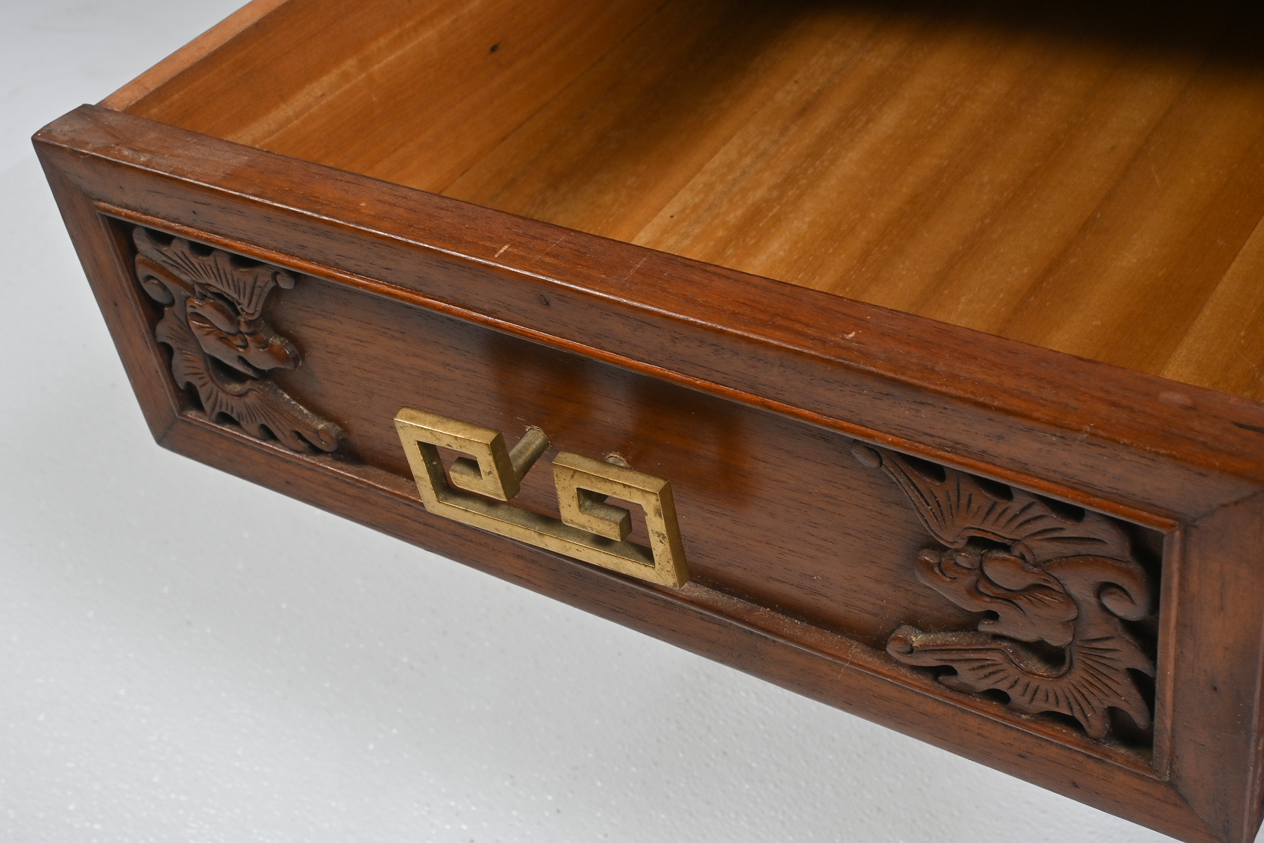 CARVED CHINESE ETAGERE: Teak, Two-piece, multi-level display cabinet with geometric carved panel endcaps. Having a carved dragon motif at the panels, doors & drawer corners. Brass drawer-pulls and etched brass panel hardware at the doors which open to an adjustable interior shelf. The opposite side has a drawer/doors facade. Approx. 65.5'' h x 40.5'' w x 17.25'' d.