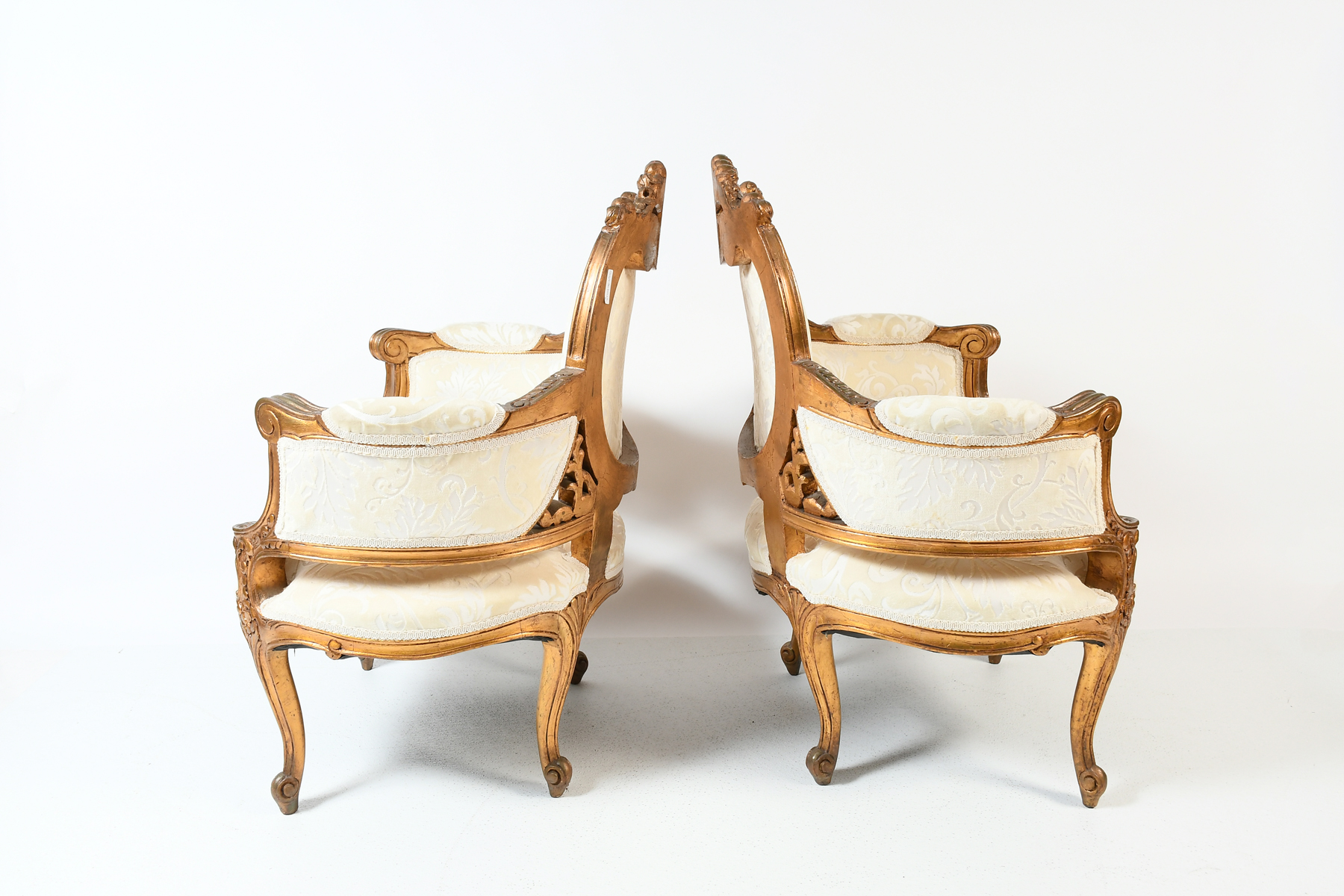 PR. EARLY FRENCH GILDED WOOD ARMCHAIRS: A pair of Early 19th to late 18th-century carved giltwood bergere armchairs. The ornate frames having a blossom motif surmounted by asymmetrical pierced and carved volute crests. The wide, cushioned seats, arm & backrests all upholstered in white floral cut velvet. All upon cabriole legs and scroll-toed peg feet. Approx. 36'' h x 31'' w x 22'' d.