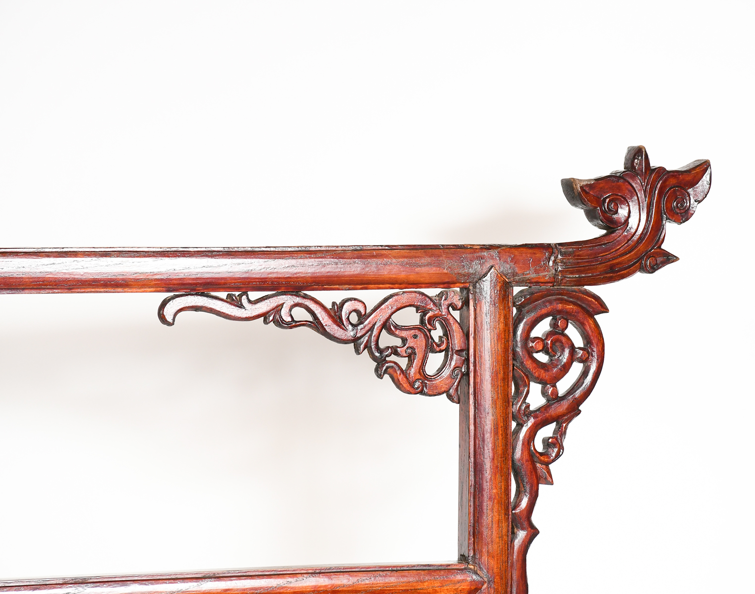 19TH-CENTURY CARVED ELM CHINESE BLANKET RACK: A broad blanket rack or kimono stand carved of elmwood with three pierced panels, the outer panels with Chinese longevity symbols, and the central panel having many fish, birds, and dragon. Approx. 63.25'' h x 82'' w x 19.5'' d.