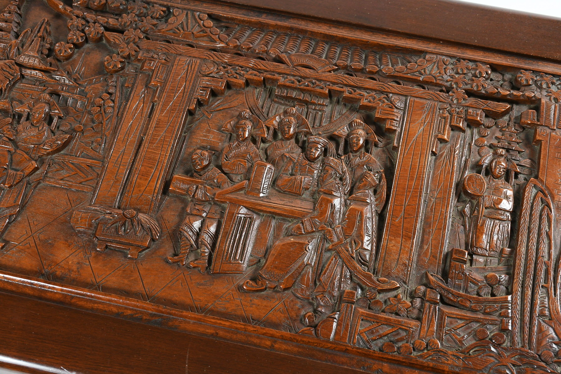 GEORGE ZEE CARVED ORIENTAL MOTIF BLANKET CHEST: Carved wood blanket chest by George Zee & Co. Having incredibly detailed hand carved scenes at the lid and each side. With engraved brass strap work, corner protectors, handles, and latch. The cedar-lined interior has a sliding, removeable tray and George Zee & Co. plaque w/ serial number. On bracket feet. Approx. 21.5'' h x 48'' w x 21'' d.